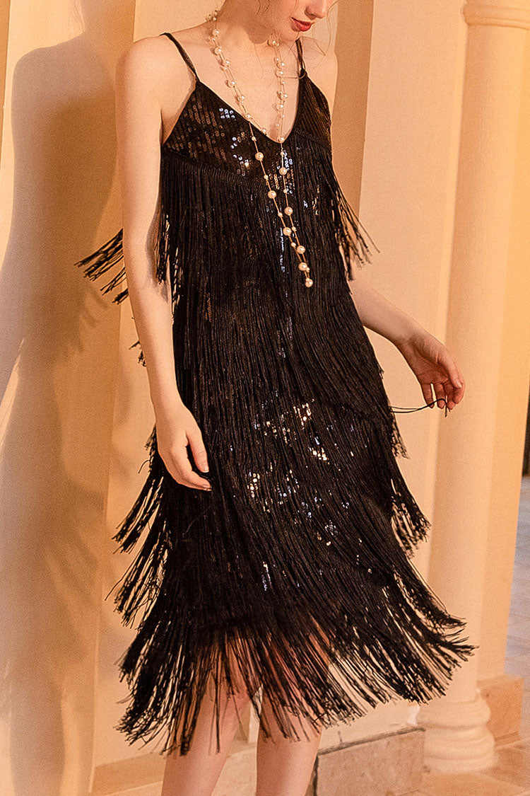 Still reminiscing the glamour and sophistication of the Roaring Twenties? Look no further than our exquisite collection of 1920s-inspired dresses that will transport you back to the golden age of fashion. Featuring a V-shed neckline. spaghetti straps on the shoulders. intricate sequin detailing and layered fringe embellishments adding a playful touch. while the fitted silhouette that is designed to flatter every figure. this flowy slip midi dress in our boutique is designed to make women feel like a modern-day flapper. Pair it with a statement headband. feather boa. and vintage-inspired jewelry for a vintage party outfit that is sure to turn heads.