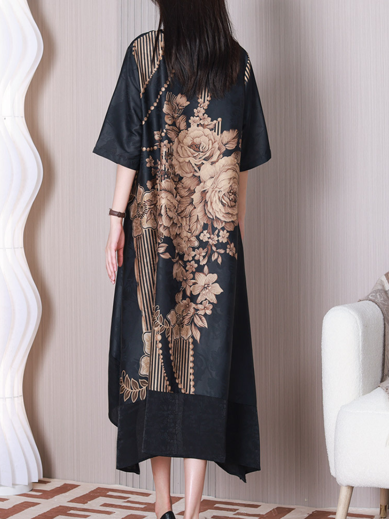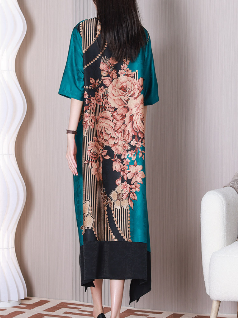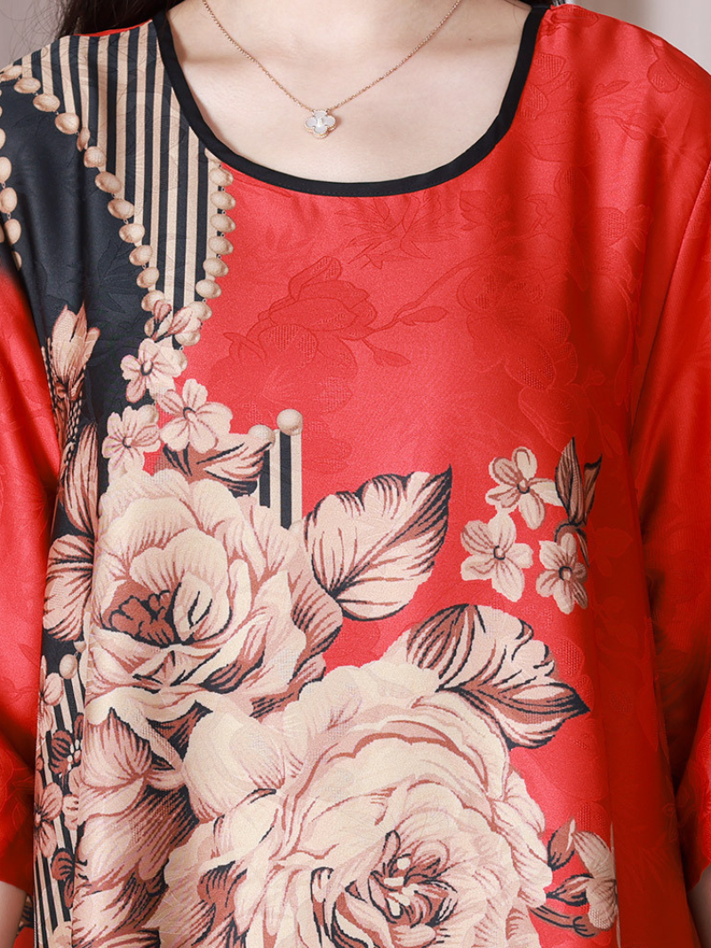 This is a short description of a garment made from Tencel fabric in black. blue. or red color with a round neck and a middle waist. The garment is adorned with a floral pattern. adding a touch of elegance and sophistication to the overall design. Tencel is a sustainable fabric made from eucalyptus wood pulp. known for its softness and breathability. making it comfortable to wear in all seasons. The middle waist accentuates the wearer's figure. while the round neck creates a timeless and classic look. The combination of the floral pattern and the rich color options makes this garment perfect for both casual and formal occasions.