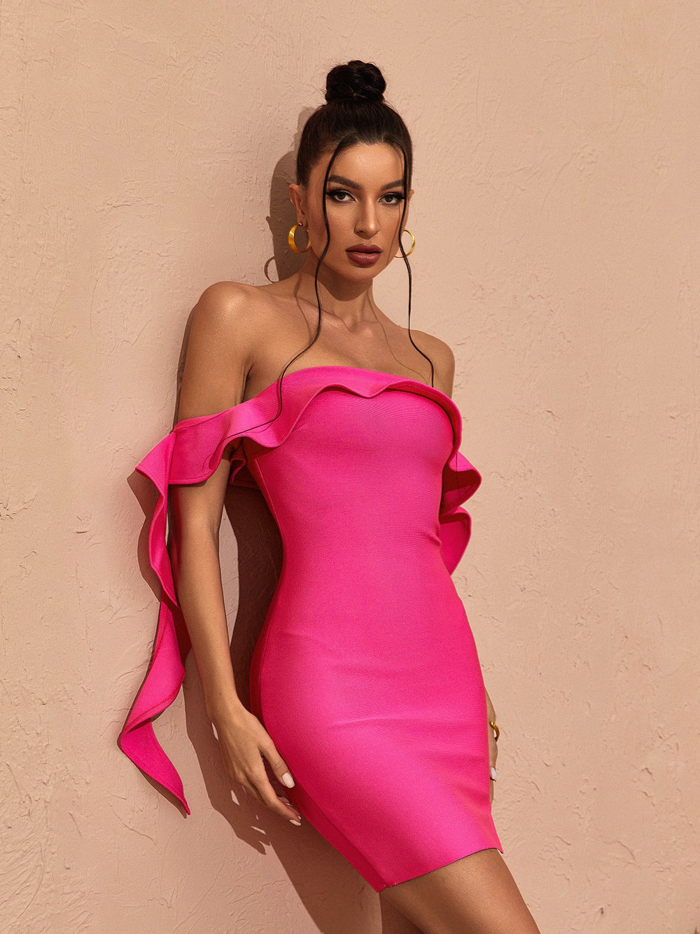 Express your unique style in this sassy Alivia Off Shoulder Ruffle Bandage Dress! Perfect for making a statement with its bold pink shade. off-shoulder neckline and ruffle detailing. this mini-length number is sure to make you the center of attention! Attending a party? This dress has 'show-stopping' written all over it!!