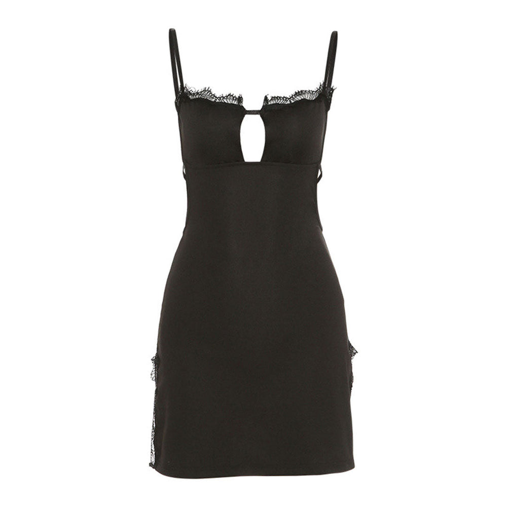 Sexy and feminine. this little black mini dress is ideal for bars & nightclubs. Made of lace and polyester. embellished with eyelash trims on the neckline and sides. featuring a playful keyhole cut-out to the front. dainty shoulder straps on the shoulders. an alluring open back with a slender strap to the rear. and a short length accented with amazing side slits. Find more trendy and affordable club dresses for women from our boutique clothing collection. Keep your go-to look eye-catching yet chic by pairing with black dainty stilettos.
