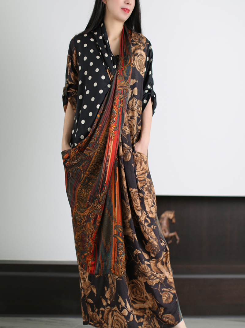 This A-line dress is a luxurious and fashionable choice for any modern woman who values both style and comfort. Made from a premium blend of Mulberry silk and polyester. this dress offers a silky-smooth texture that feels incredibly soft against the skin. The Mulberry silk adds a touch of opulence and sheen to the fabric. while the polyester provides durability and ease of care. The dress features a stylish V-neck that adds a flattering and feminine touch to the design.The long sleeves provide coverage and warmth. making it suitable for cooler weather or occasions that require a modest dress code. The multi-color pattern adds a playful and eye-catching element to the outfit. making it a perfect choice for those who love to experiment with bold and vibrant prints. With its commuter style. this A-line dress is perfect for women on the go who want to look chic and sophisticated while maintaining comfort.
