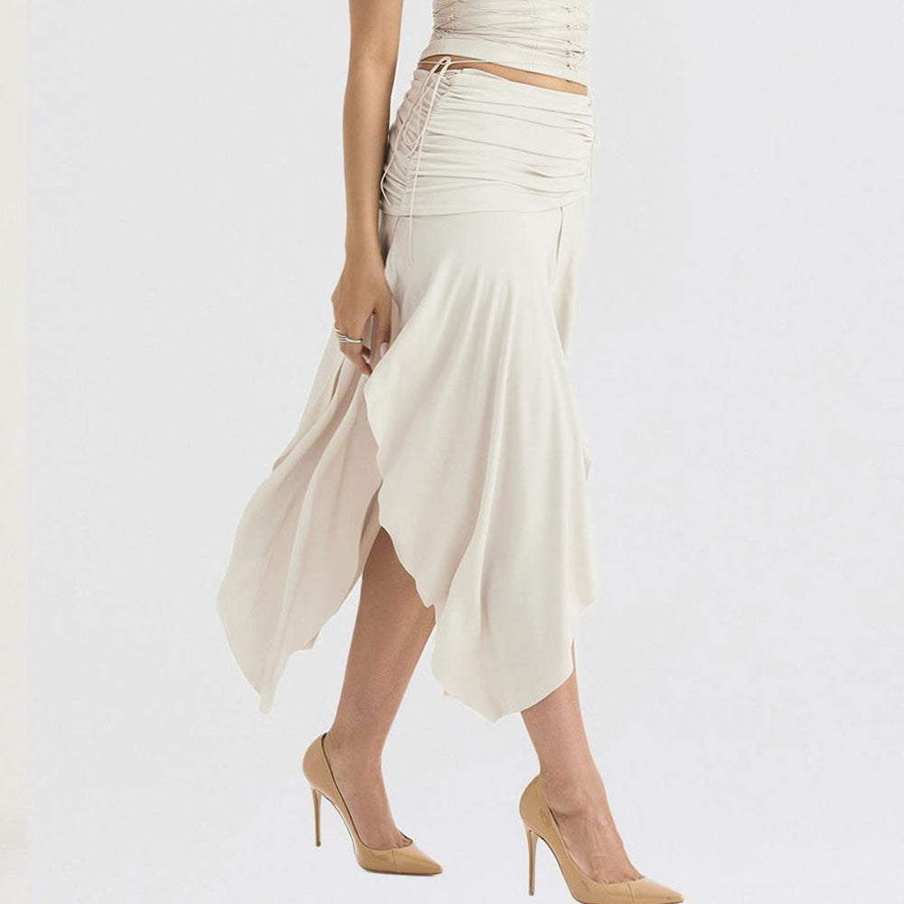 The captivating asymmetrical skirt that will make you fall in love at first sight. this drop-waist skirt crafted from luxurious silk fabric. ruched trim detailing adds a touch of charm and texture. creating a unique and eye-catching look. With its elegant asymmetrical hemline. this skirt effortlessly captures attention and showcases your fashion-forward sense. The side zipper ensures easy wear. while the partial lining provides comfort and coverage. Pair it with a trendy lace up crop top and your favorite heels to create a truly mesmerizing ensemble.
