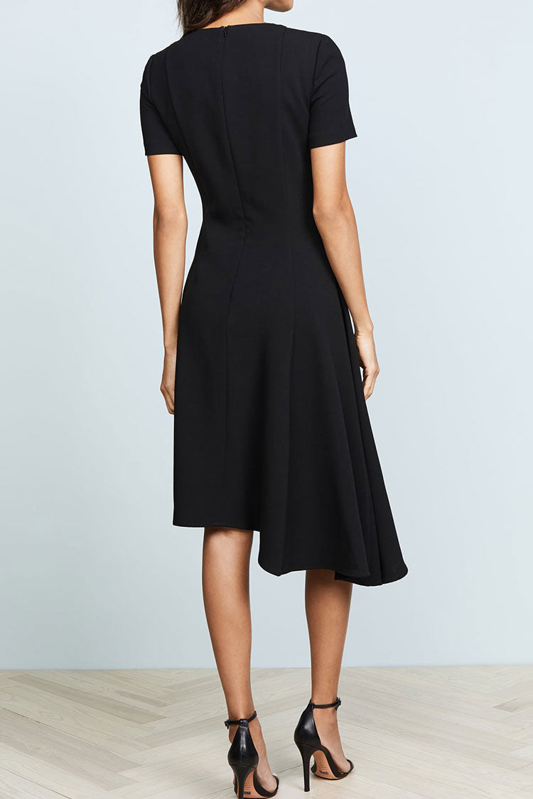 Little black dresses are absolutely beautiful and trendy. The ready-to-work little black dress. for women with tastes. adds a touch of modernity and sophistication to the classic work outfit. making it a versatile wardrobe staple for any fashion-forward professional. Featuring a timeless round neckline. short sleeves. a stretchy fit-and-flare silhouette in a bias cut hemline creating an intriguing and stylish visual effect. this asymmetrical style midi dress in our boutique is designed to be comfortable. functional. and easy to wear. while still maintaining a chic and polished appearance. Style it with black strappy heels in an elegant way or a bold way with your bright-colored stilettos.