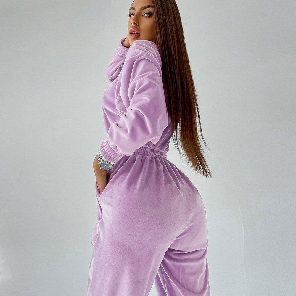 This sporty style jumpsuit is a warm and cute all-in-one piece this fall and winter. Made from blend velvet and polyester fabric. embellished with a covered elastic waistband along with a drawstring. featuring a crew neckline in a pullover design. long sleeves trimmed with elastic cuffs. and a jogger styling ended up with elasticated cuffs. Find more unique women's jumpsuits or trendy clothing in our boutique. and keep it casual with a pair of sneakers.