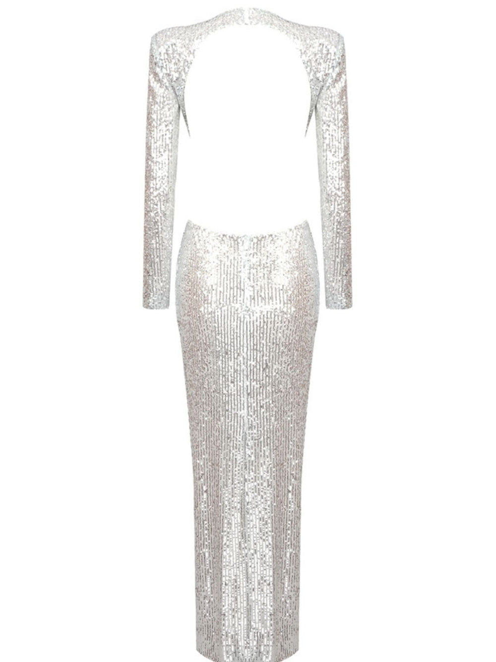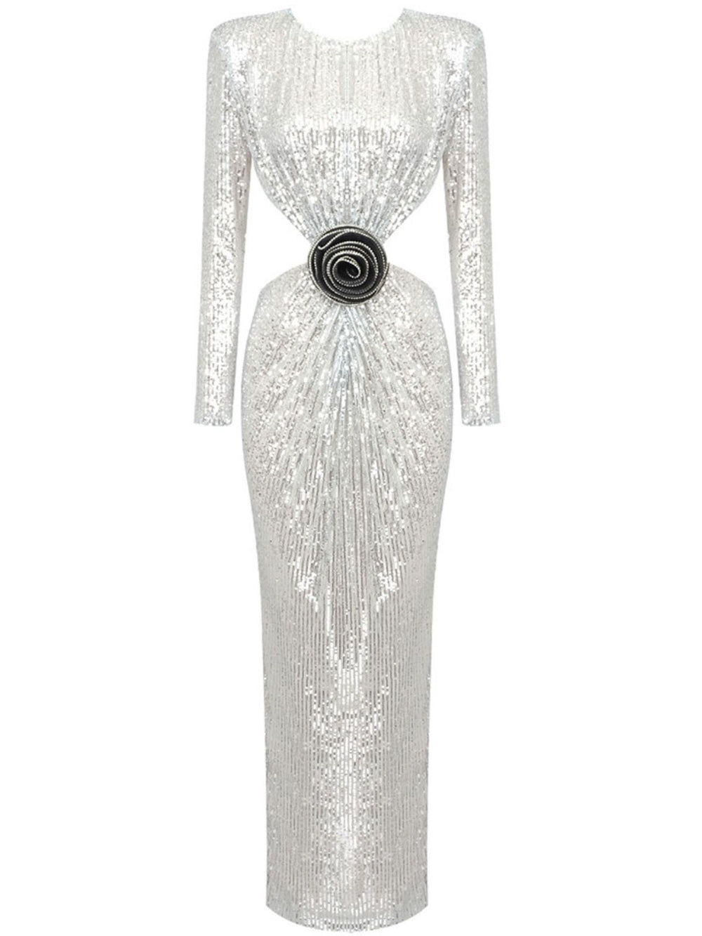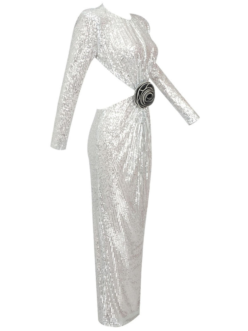 Stand out with stylish style in this unique Aviva Long Sleeve Cutout Sequin Maxi Dress in Silver. It features a dramatic waist cutout. long sleeves. and a maxi dress length for a modern look. The dress is constructed of ultra glam sequins and comes with a detachable embellished flower for the perfect finishing touch.