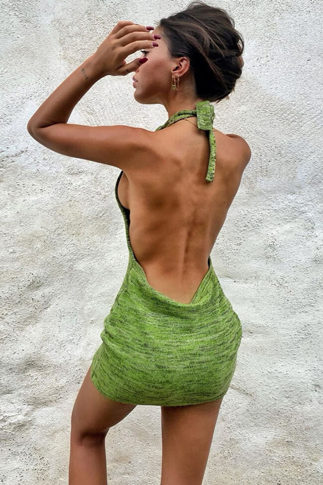Your new beach resort outfit. found. This backless halter sweater mini beach vacation dress is at once breezy and sexy. Designed with a halter tie at with frill trim. an open back. stretchy knit fabric. and a short dress cut. this cool boutique dress for women is a nice summery-ready piece that goes from beach to bar with ease. Team it with boho accessories and strappy sandals for our new journey.