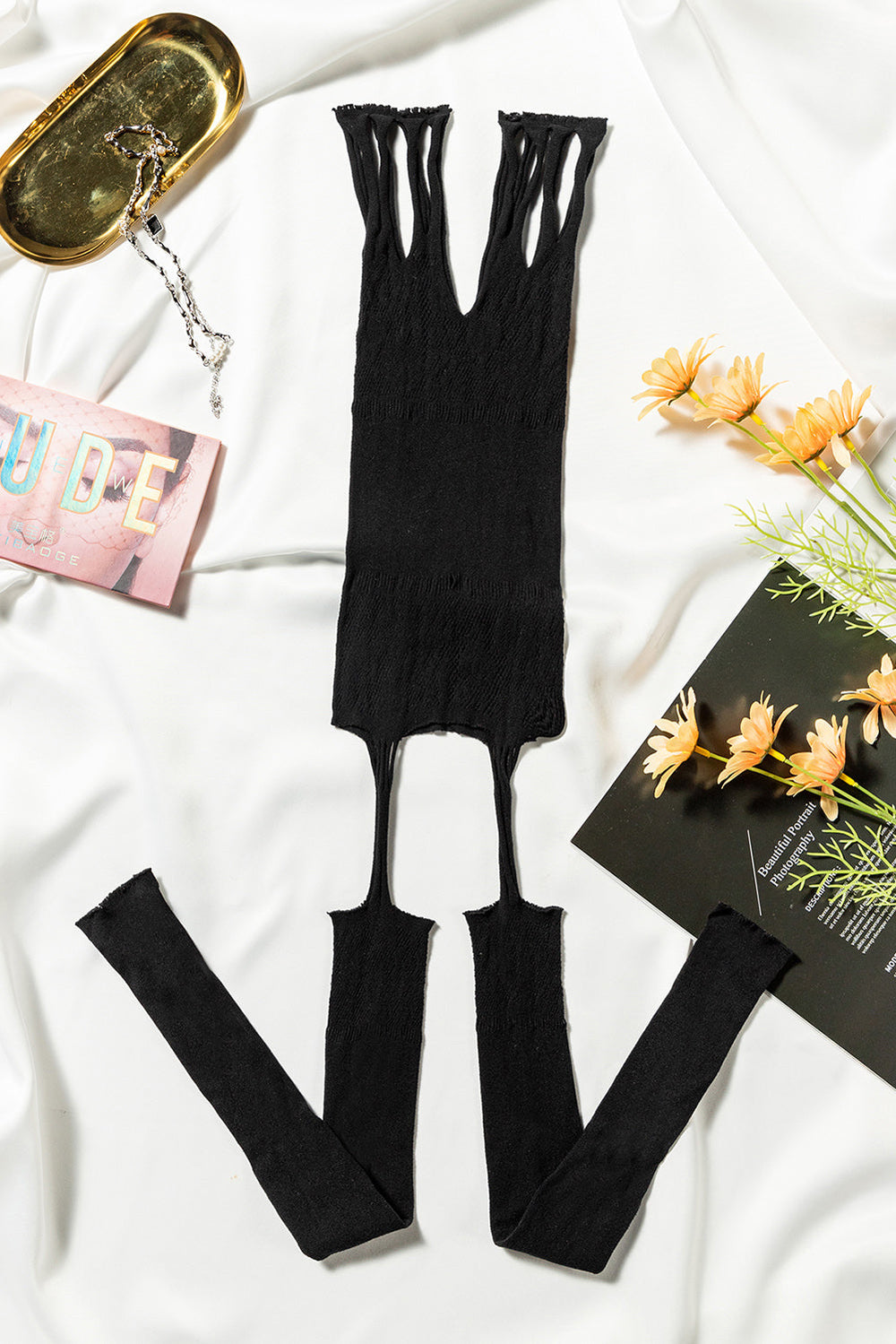 Look sexy and stylish in this Black Lace Crochet Sleeveless Body Stockings.