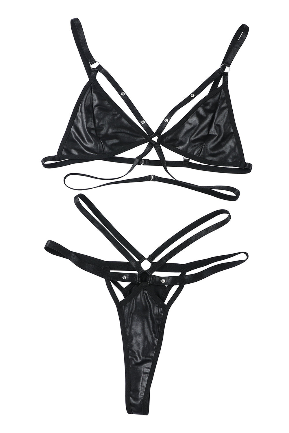 Look and feel sexy in this Black Leather Strappy Bra and Thong Lingerie Set.