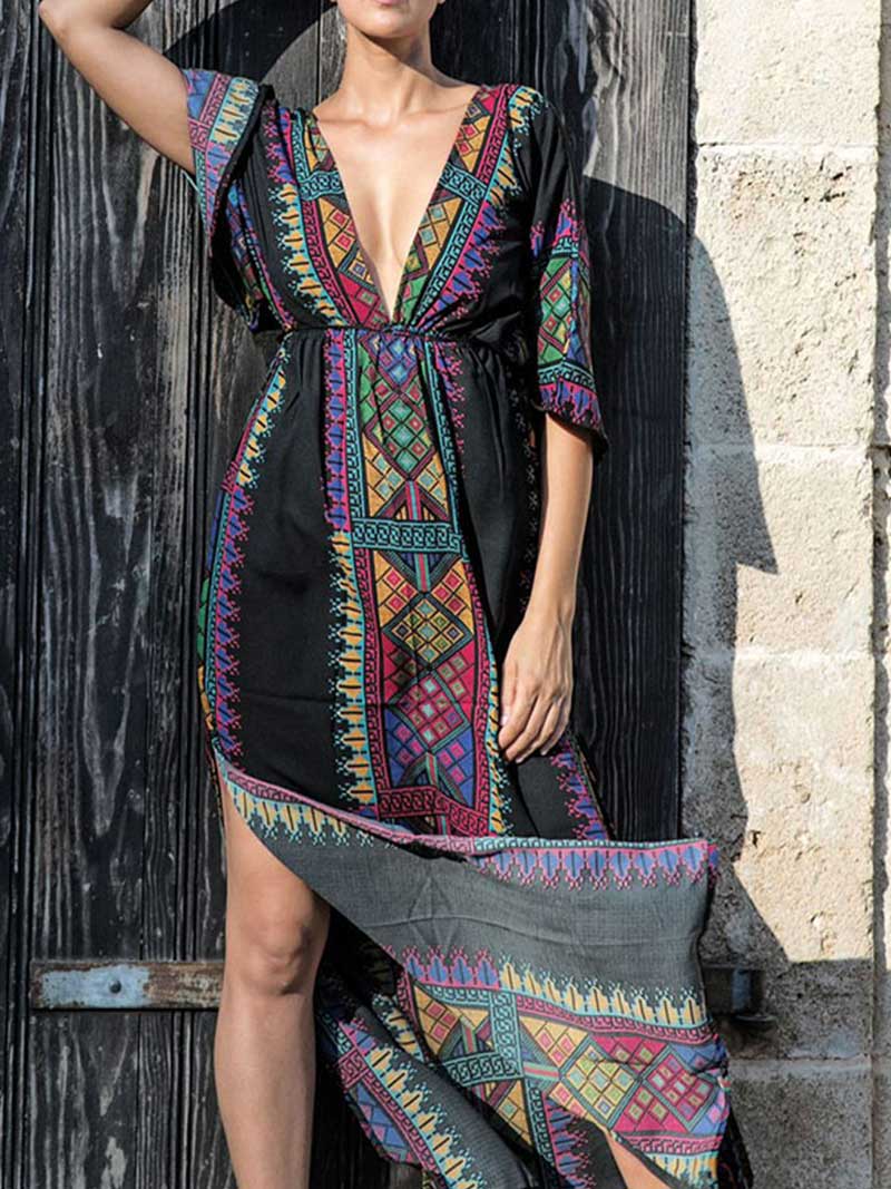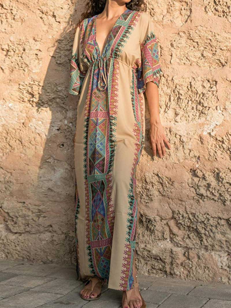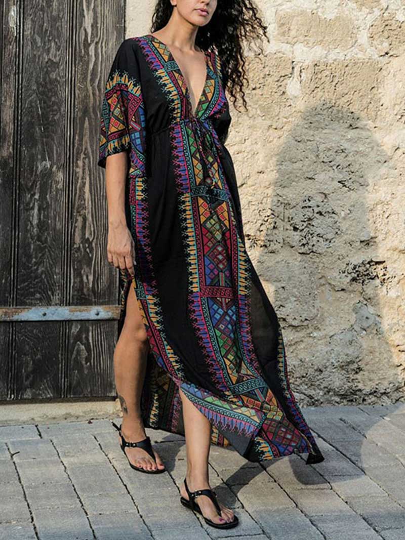 Introducing our Bohemian Print Cotton Short Sleeves Kaftan Dress! This beautiful dress is perfect for spring and summer days. Made from 100% cotton. it is light and breezy. and the loose-fitting silhouette is flattering and comfortable. The kaftan style dress features a V-neckline. short sleeves. and a bohemian print in black and beige. Pair it with your favorite sandals or flats for a chic and stylish look.