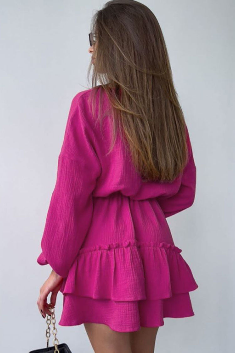 Cute and comfortable day dresses for your beach vacation plans. This flattering layered ruffle mini dress in our boutique is timeless and stunning for women. Crinkled cotton fabric in hot pink shapes this chic dress with a V-neckline along with a half button placket. an elasticated waistline with frill detail. long bishop sleeves with elasticated cuffs. Stringy-selvedge detail trims a tiered skirt that ends at a mini hem. Pair it with everything from sneakers and flats to boots.