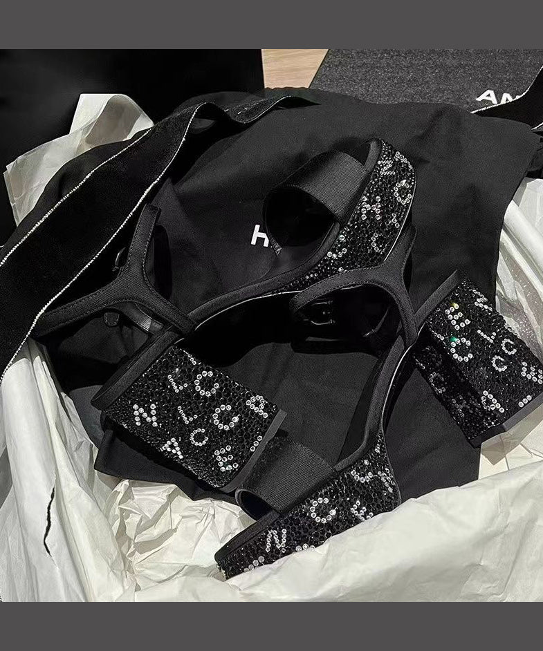 These boutique black sandals feature a chunky heel and a splicing design. with a peep toe and letter zircon embellishment.