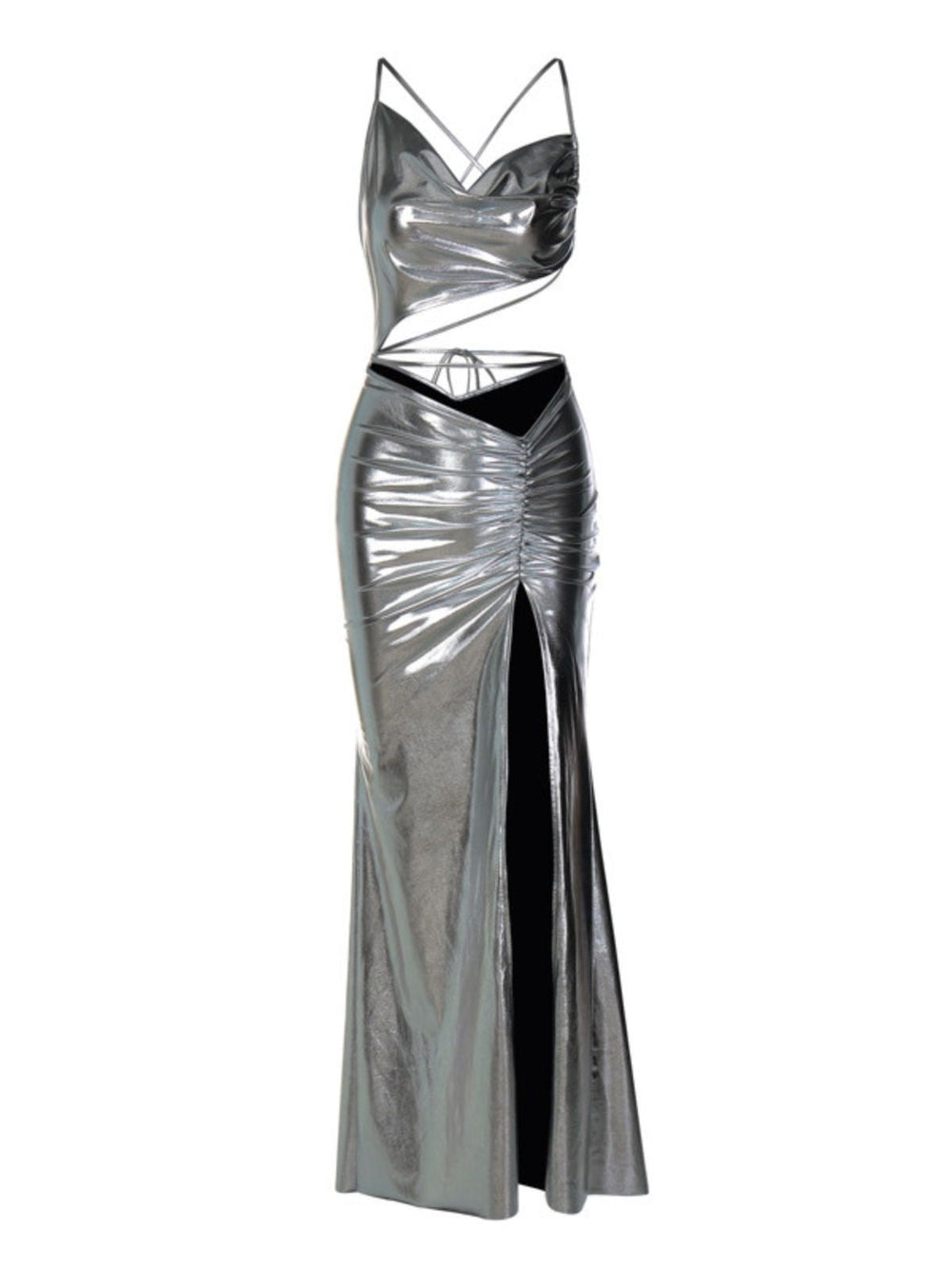 The Braylon Cutout Metallic Maxi Dress adds a stylish touch to any wardrobe. Made from a luxurious metallic fabric. this maxi dress features cutout accents that provide a subtle hint of sophistication. Whether you're attending a special occasion or just want to turn heads. this dress is sure to make a statement.