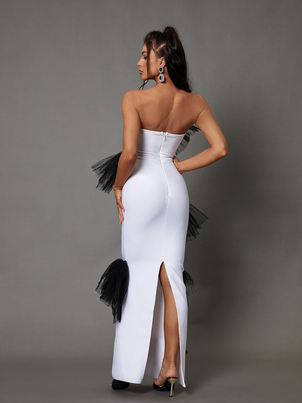 Make a stunning entrance in the Caroline Strapless Pleated Tulle Bow Bandage Dress. This alluring dress showcases a strapless neckline and a beautifully crafted pleated tulle bow detail. exuding femininity and charm. With its figure-hugging bandage design. this dress is the epitome of sophistication and is bound to make you the center of attention at any special occasion.