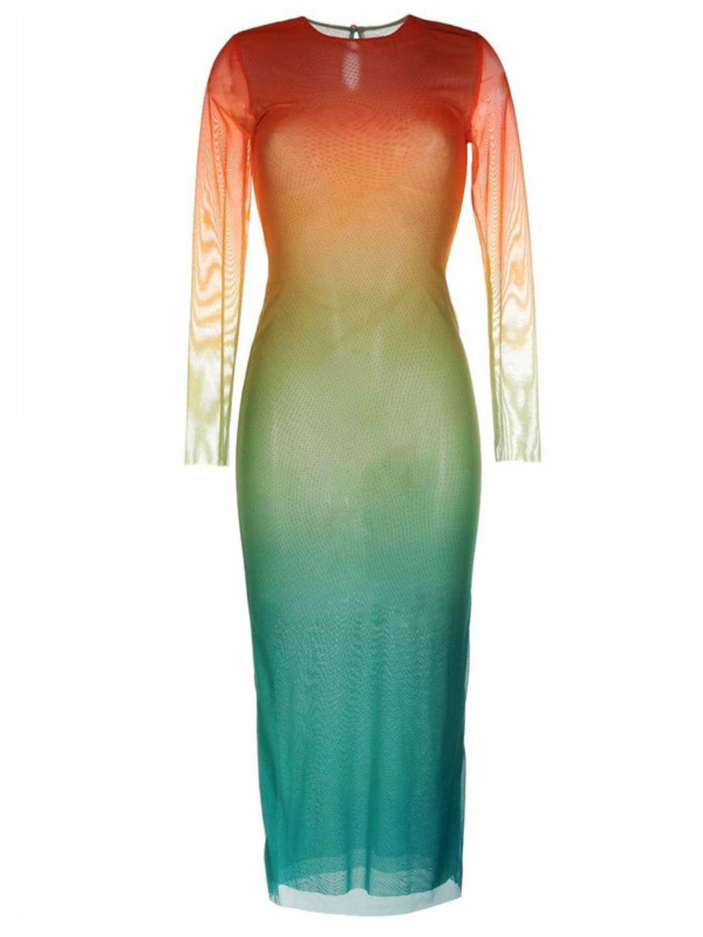Our Celestial Ombre Long Sleeve Mesh Midi Dress is perfect for making a bold statement! With a stunning multi-coloured ombre effect and airy mesh material. this unique piece will have you looking and feeling your best. Plus. the midi length provides a flattering silhouette.