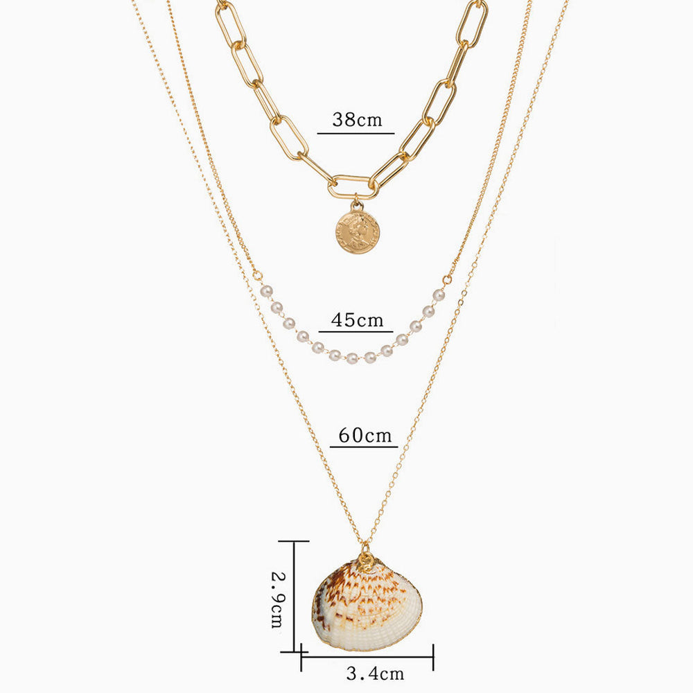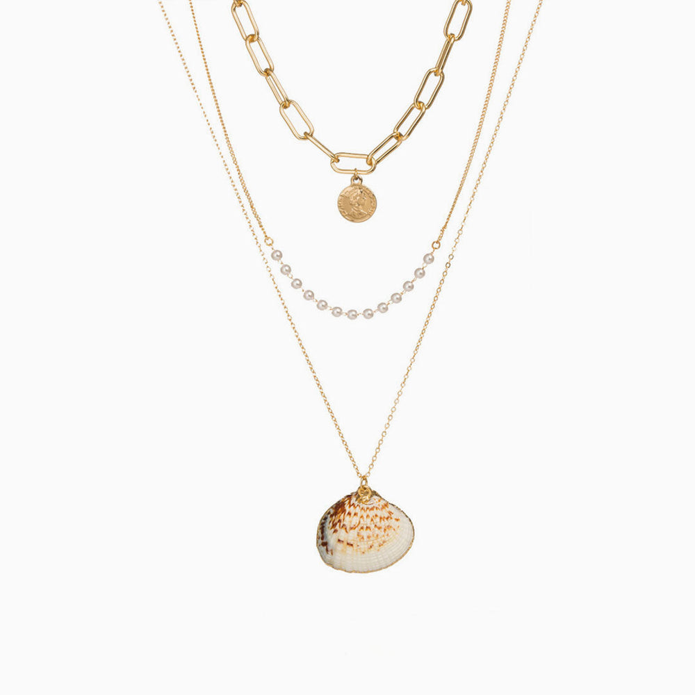 Add a pop of color to your everyday look with this layered necklace. Crafted with gold plated alloy. sand out in beach-effect shell. burnished beads and gold-tone coin charms. featuring a treble-strand chain along with an adjustable fit and finished with a spring-ring fastening. Find more unique women's necklaces and trendy Jewelry in our boutique. and mix and match with your other gold chains for a chic new look in style.