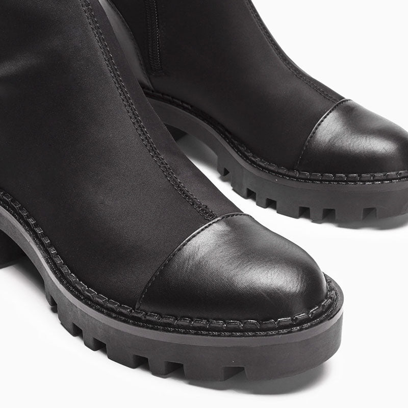 The block heel boots are all about making a statement that everyone will remember! Made of PU leather and rubber. embellished with a panelled design upper presented with seamed stitch detailing. featuring a round toe along with a padded footbed. a welt stitching. a lugged rubber outsole framed by a mid block heel. a half zipper fastening at the side. an over-the-knee shaft length trimmed with an elastic opening. Find more trendy women's leather boots and unique shoes in our boutique. and wear them with a party mini and a sparkly choker to complete the stunning look - Heel height: 4.5cm.