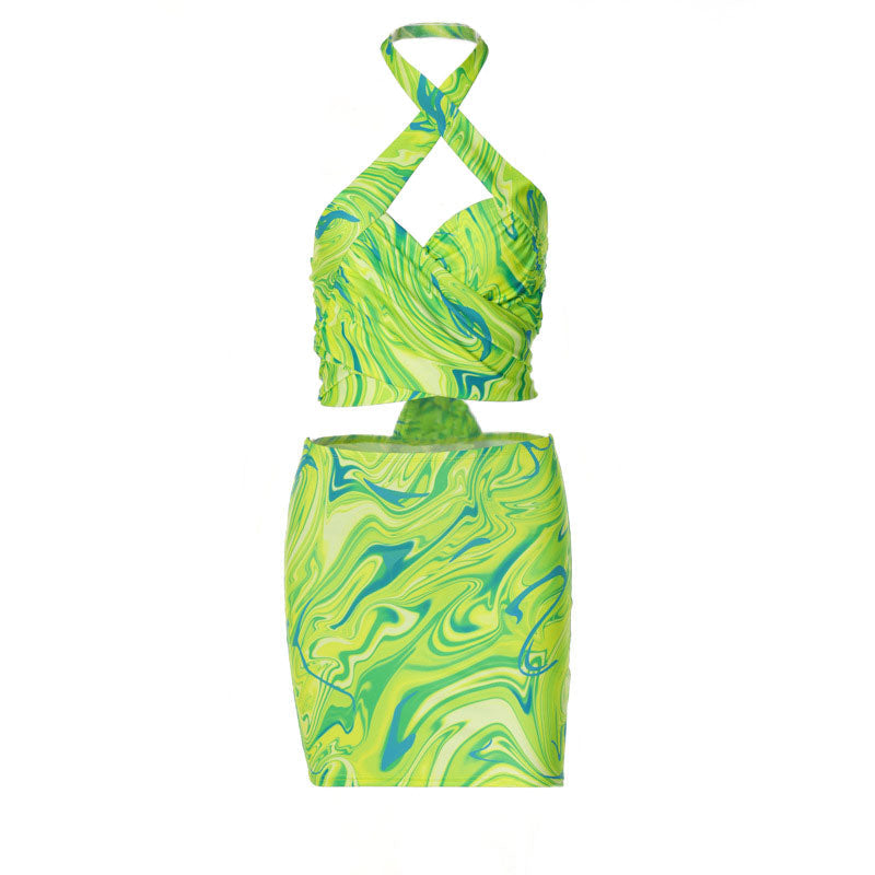 Everyone will be bowing down to your style with this abstract skirt matching set. Made of polyester and elastane. stand out in aesthetic swirl patterns allover. featuring criss-cross straps at the neck along with a fancy cutout effect. a sleeveless bodice embodied with wrapped charms and gathered trimmings. tie straps at back. and complete a vibrant two piece set with a slim-fit mini skirt. a pullover styling finished with a short length. Find more unique women's stylish matching sets or trendy clothing in our boutique. and team it with a chain bag for a beautiful look.