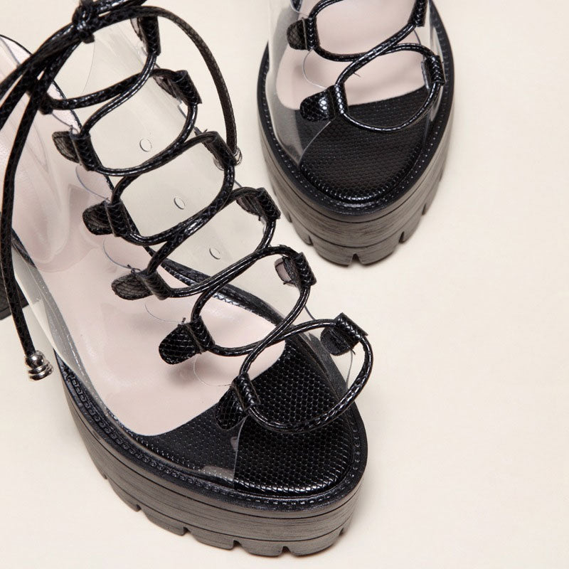 Strut in style wherever you go by rocking these edgy lace-up clear PVC ankle booties. Crafted with transparent PVC. PU leather and rubber. stand out in a pvc upper along with cutouts. featuring a round toe styling accented with lace-up closures and faux-leather eyelets at the vamp. a back pull tab at the cuff. a ridged sole anchored by a sturdy block heel. Find more trendy women's cut-out summer boots and unique shoes in our boutique. and style them with a bodycon slip mini dress for a stylish look - Heel height: 13 cm.