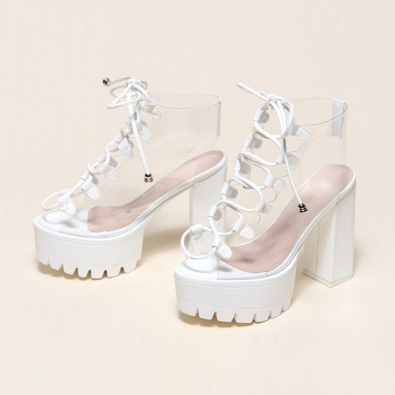 Strut in style wherever you go by rocking these edgy lace-up clear PVC ankle booties. Crafted with transparent PVC. PU leather and rubber. stand out in a pvc upper along with cutouts. featuring a round toe styling accented with lace-up closures and faux-leather eyelets at the vamp. a back pull tab at the cuff. a ridged sole anchored by a sturdy block heel. Find more trendy women's cut-out summer boots and unique shoes in our boutique. and style them with a bodycon slip mini dress for a stylish look - Heel height: 13 cm.