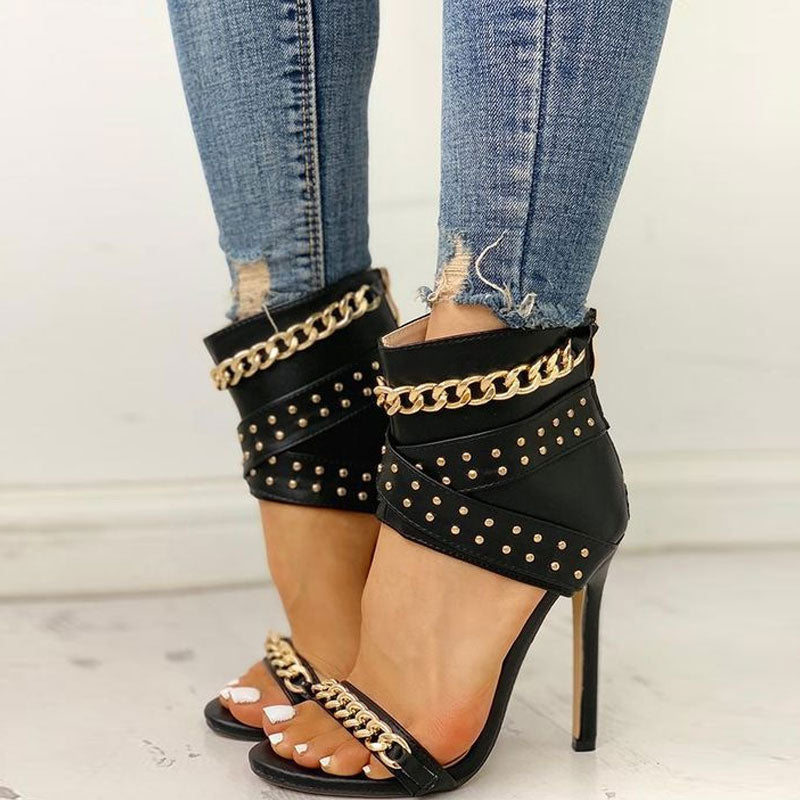 Say hi to your go-to sandals. Crafted with PU leather and rubber. stand out in metallic rivets embellished to the vamp. featuring an ankle bootie styling with a chunky chain. an open toe to the front and a zip fly to the rear. and stiletto heel soles along with rubber heel caps. Find more trendy women's sandals and unique shoes in our boutique. and wear yours with a pair of skinny jeans for a street look - Heel height: 11 cm.