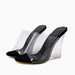 This pair of wedge sandals is simply a modern update of a classic style. no question about it. Crafted with blend vinyl. suede. PU leather and rubber. stand out in transparent effect. featuring slip on styling. peep open toes trimmed with a PVC vinyl strap. sculpted acrylic wedge platform along with rubber heel cap. Find more unique women's wedge shoes and trendy shoesin our boutique. and try them on with anything from chic shorts. jeans to flowy dresses for a casual chic look- Heel height: 11.5 cm.