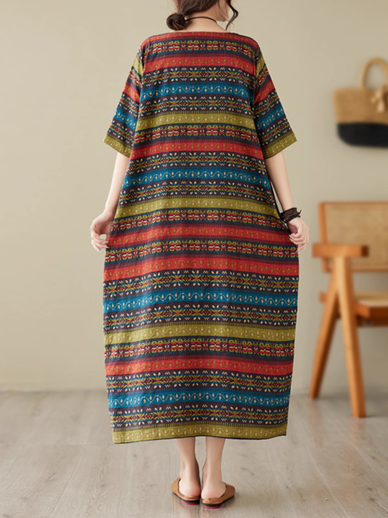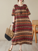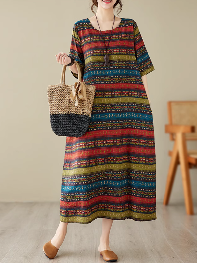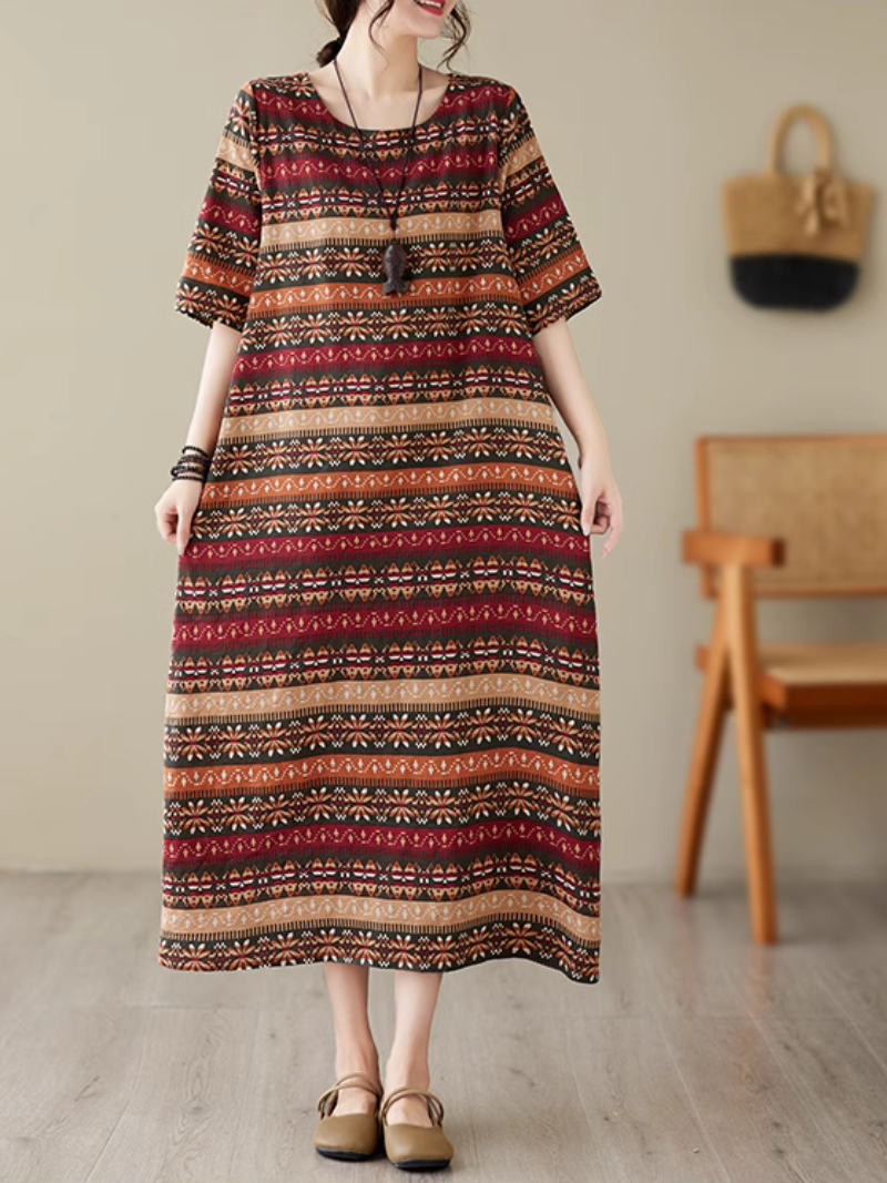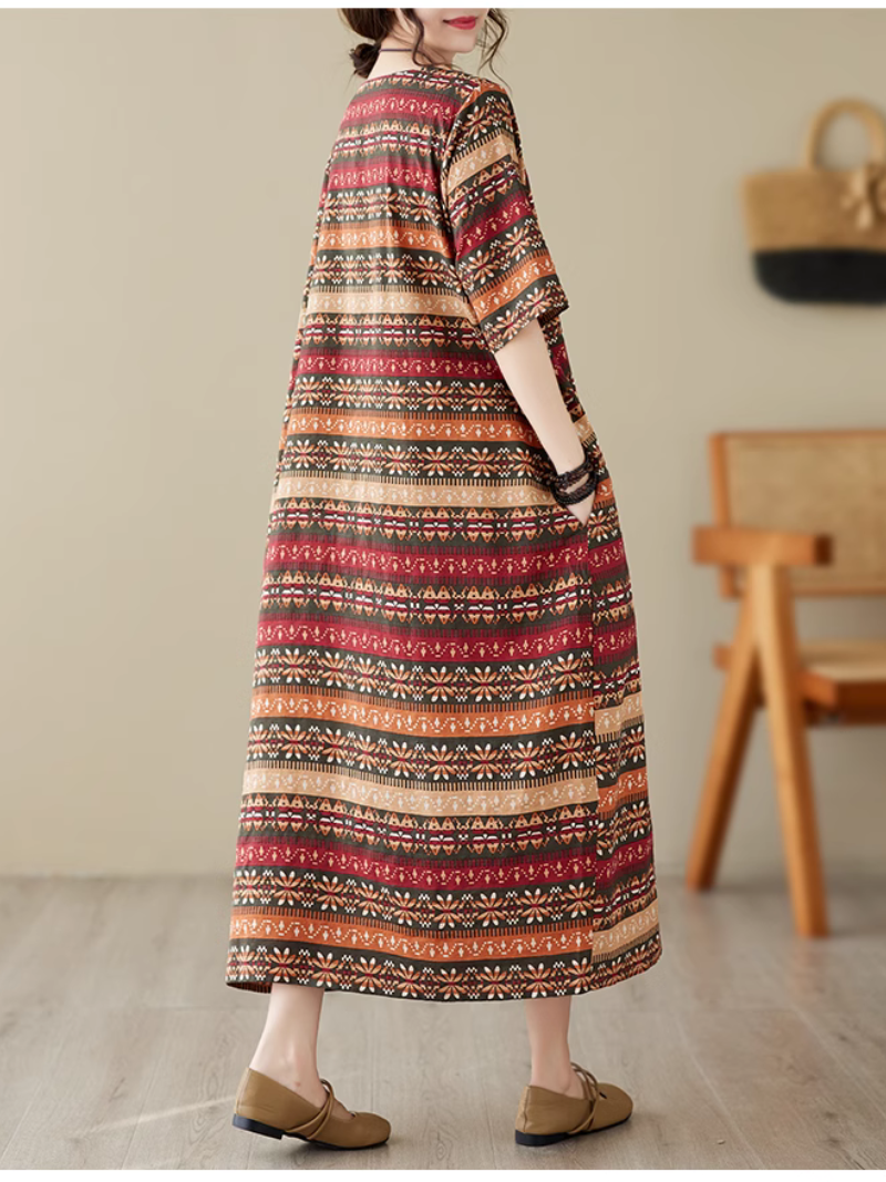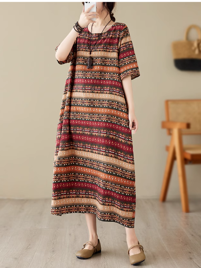 Women's Color Striped Printed Midi Dress. crafted with soft and breathable slub cotton material. This delightful dress features short sleeves and a comfortable round neck collar. The dress is available in two charming colors: coffee and blue. allowing you to choose your preferred style. With three size options (S. M. L). you can find the perfect fit. The dress lengths range from 111cm to 113cm. while the shoulder widths range from 40cm to 42cm. The bust measurements vary from 102cm to 110cm. Embrace effortless style and comfort with this versatile striped printed midi dress. suitable for various occasions.