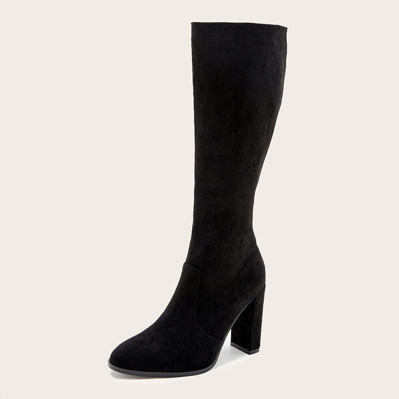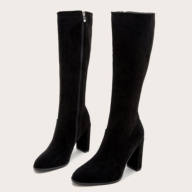 The maximal high-heel boots make a bold statement. Crafted with soft suede and rubber. stand out in a slim-fit knee high shaft adorned with an exposed zip fastening. featuring a pointed closed toe decorated with panelled upper. a lightly cushioned footbed anchored by a covered block heel. a rubber sole accentuated with nonskid markings. Find more trendy women's chunky heel boots and unique shoes in our boutique. and try them on with a velvet mini dress and a tote bag - Heel height: 9.5cm.