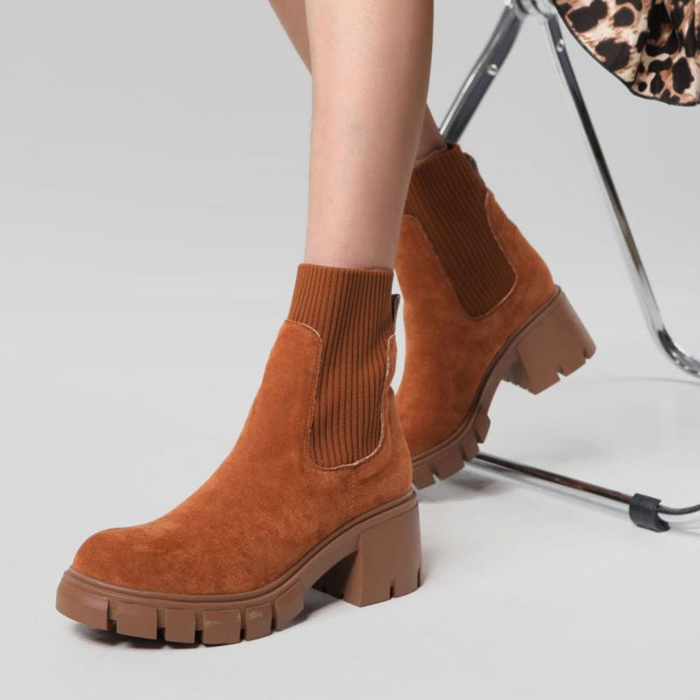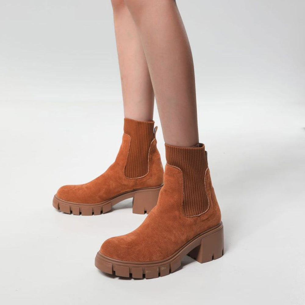 Flaunt your flawless fashion choices with the Chelsea suede ankle booties. Crafted with suede. ribbed knit and rubber. stand out in an elastic knitted gore paneled with suede trims. featuring a closed round toe. a cushioned footbed anchored by a rubber ridged outsole and a low-block heel. a slip-on styling trimmed with a pull-tab at the opening. Find more trendy women's sock boots and unique shoes in our boutique. and style them with a skirt matching set and a shoulder bag - Heel height: 4.5cm.