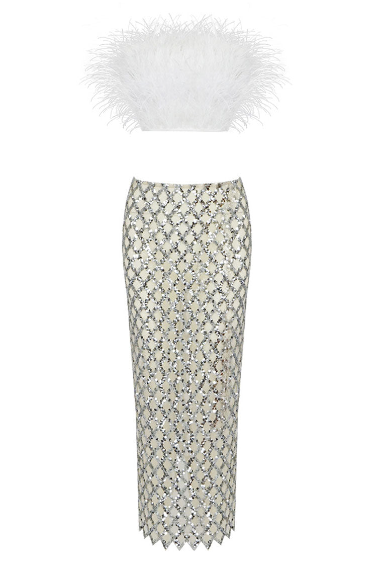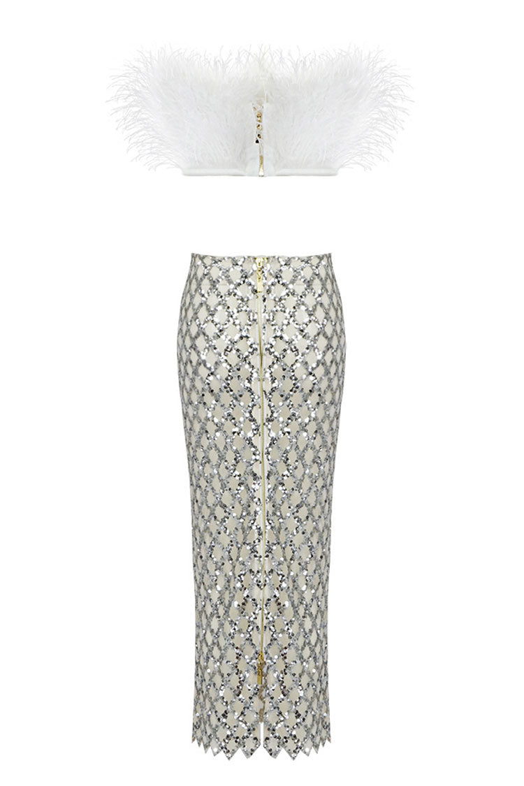 Your new evening matching set has arrived! Breathtaking two piece dresses for women are coming back this season with a feather twist. There's no doubt about it. This quietly brilliant embellished & sequined outfit is a fun update from our feather-trimmed dressing collection. featuring a fancy strapless top covered with fanciful wispy faux feather details and finished with a metal zip closure at back. a dazzling bodycon midi sheer mesh skirt without any lining offering a glitter yet effect and rhombus sequined embellishments with glitz and glamour to elevate the whole silhouette. Style this boutique two-piece gown set with a fitted miniskirt you like and stilettos to complete this glamorous special occasion outfit.