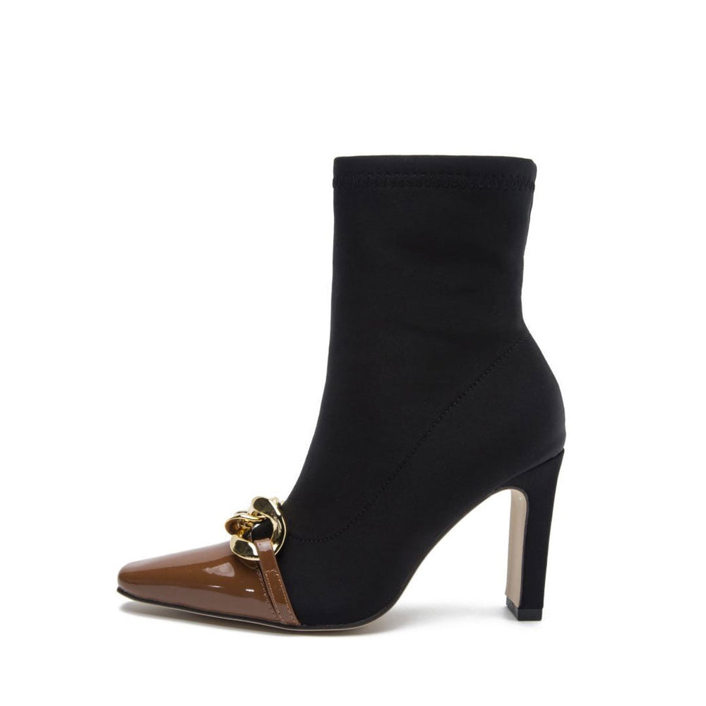 The pointed toe ankle booties are model-off-duty meets office chic. Crafted with polished PU leather and rubber. stand out in contrasting paneled designs. featuring a pointed closed toe blanketed with a metallic chain statement and a patent finished upper. a faux leather shaft structured with an exposed tonal zipper closure. a cushioned footbed enhanced by a covered block high heel and a rubber heel cap. Find more trendy women's sock boots and unique shoes in our boutique. and try them on with a velvet dress and a long-sleeve cardigan - Heel height: 9cm.