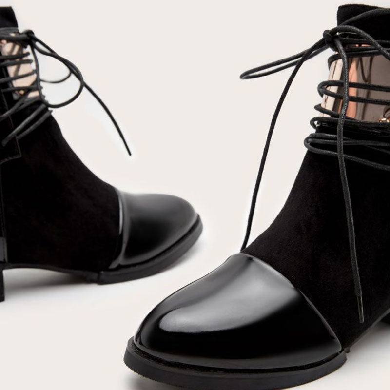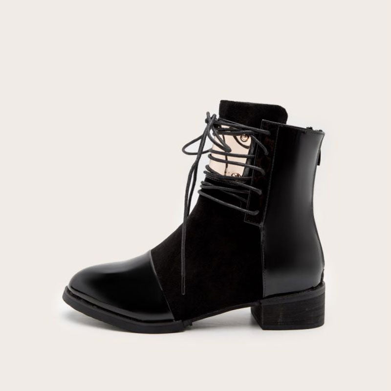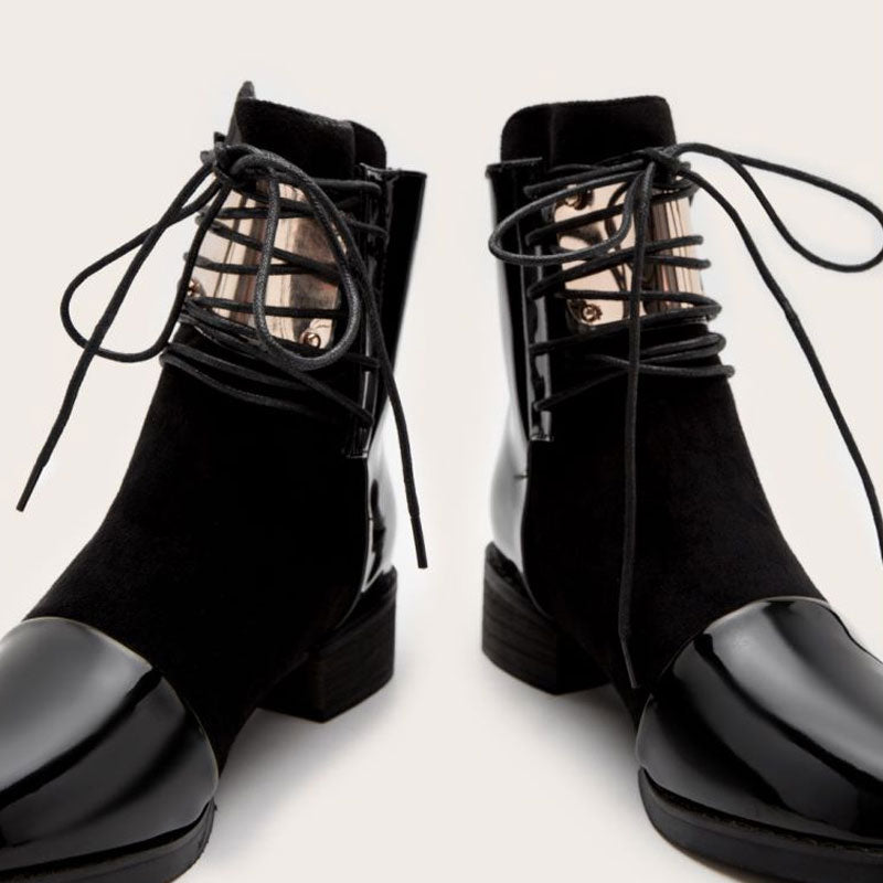 Step into fall in style in the block heel ankle booties. Crafted with PU leather. soft suede and rubber. stand out in contrasting panelled designs. featuring a closed round toe. a metallic hardware followed by front lace-up closures. an exposed zipper to the rear. a cushioned footbed anchored by a stable low-block heel and a rubber heel cap. Find more trendy women's lace-up boots and unique shoes in our boutique. and style them with a midi dress and a pearlized necklace - Heel height: 5cm.
