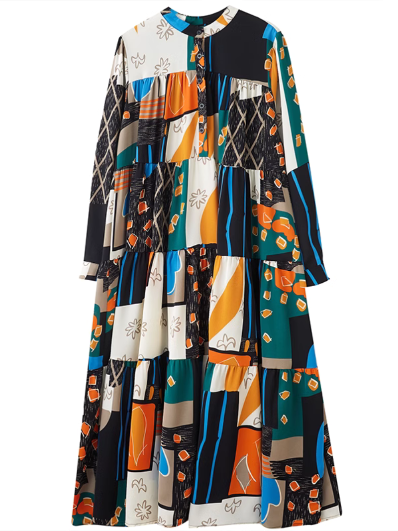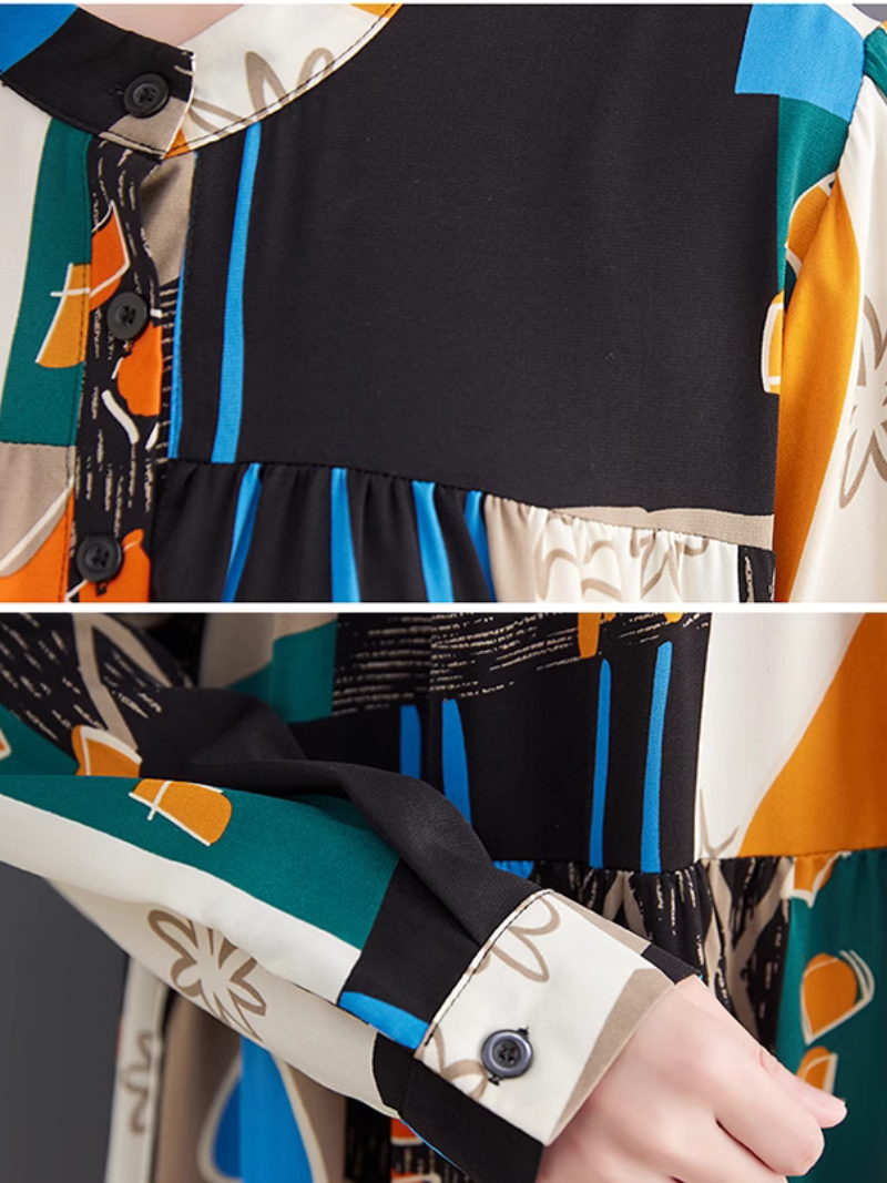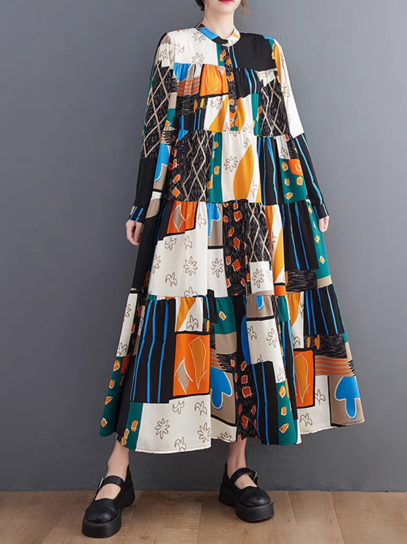 Discover elegance with our Women's Print Collar Front Button A-line Dress. Crafted from a blend of comfortable blended cotton. it exudes sophistication. The stand collar adds a touch of refinement. while the loose waist and long skirt ensure comfort without sacrificing style. Long sleeves provide versatility for various occasions. This dress comes in a free size. with measurements of 125cm length. 132cm bust. 60cm sleeves. and 39cm shoulder width. Elevate your wardrobe with this timeless A-line dress. perfectly suited for capturing attention and expressing your unique sense of fashion.