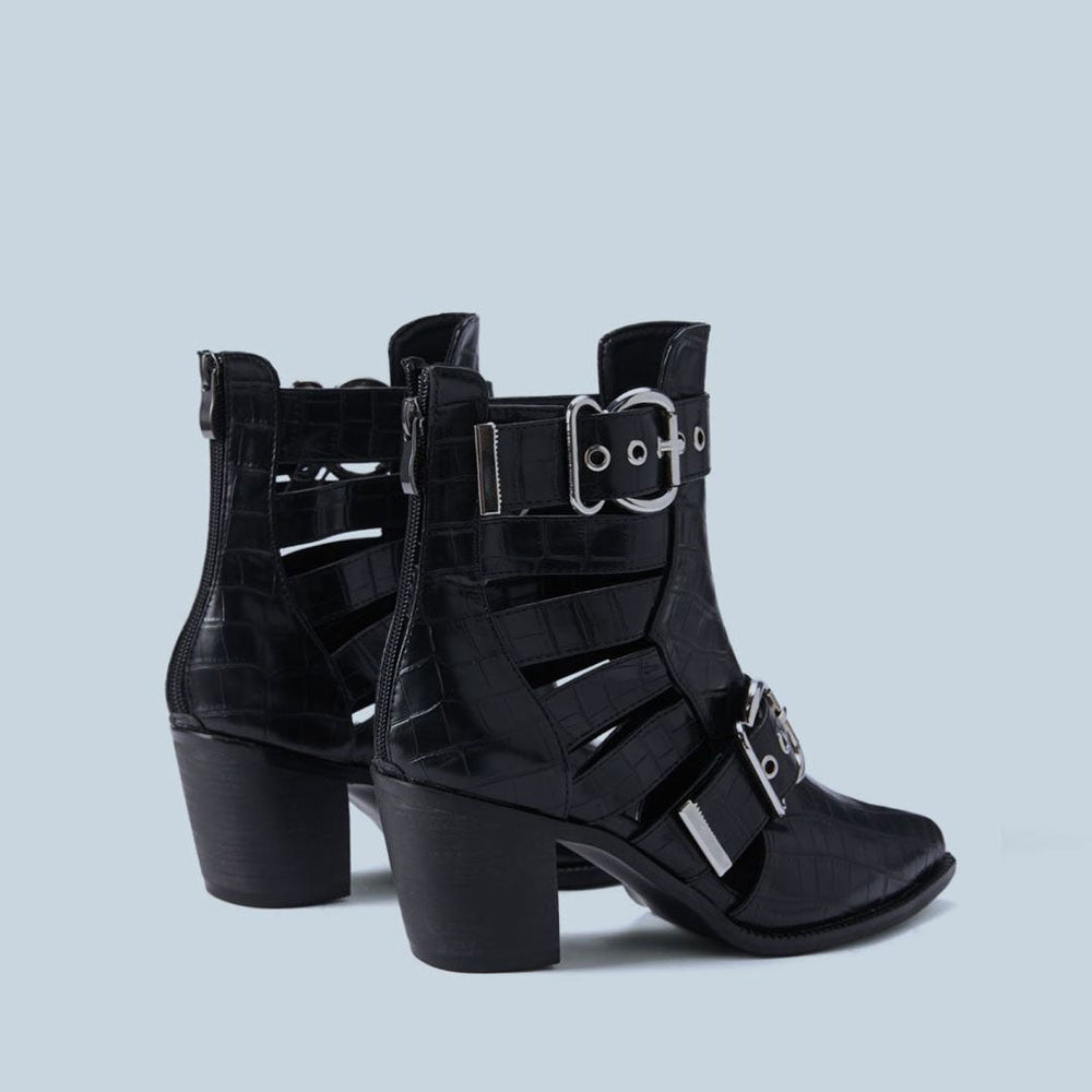 These stylish buckle booties go from fall to winter seamlessly. Made of PU leather and rubber. embellished with a crocodile skin effect throughout. featuring a pointed toe enhanced by wild silver-tone adjustable buckle closures. cutout detailing at the side. a cushioned footbed anchored by a stacked cuban heel and a rubber heel cap. a zipper fastening to the rear. Find more trendy women's pointed-toe boots and unique shoes in our boutique. and wear them with a slashed dress and a sparkly necklace to create a show-stopping look - Heel height: 6.5cm.