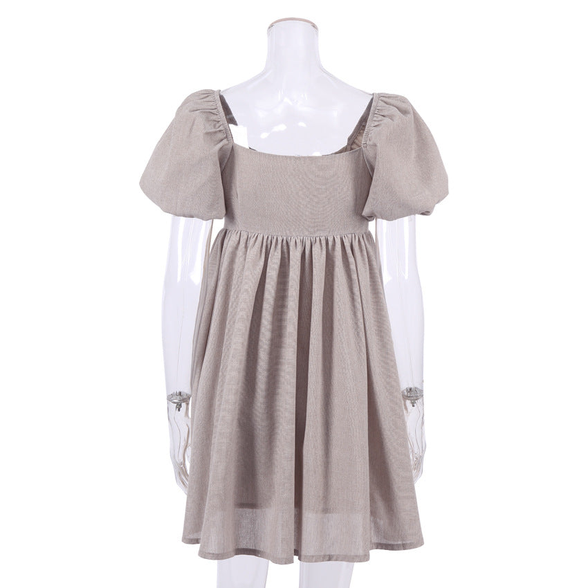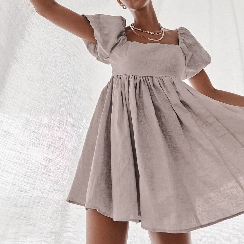 Babydoll smock dresses are the perfect finishing touch for a comfy yet cool outfit. This puff sleeve square neck babydoll mini dress in our boutique is a breezier option in summer. Featuring a square neckline in easy pull-on styling. short puff sleeves with elasticated cuffs. a high rise waistline with ruched trim. an A-line skirt silhouette with lining and a hidden zip closure in one side. this pure color mini linen dress brings a fresh. sweet feel to a classic summer dresses with a cute shape for women in sunny days. Pair it with casual sandals or slides for a complete chic look!