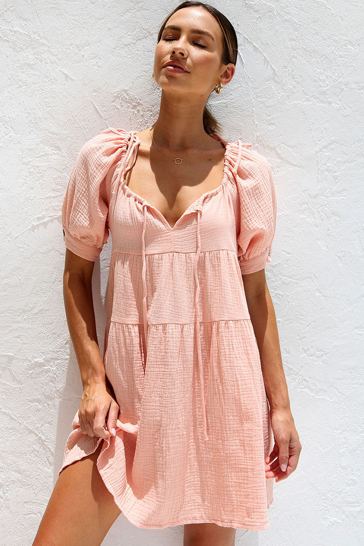 Babydoll dresses are versatile and can be worn in a variety of settings. including casual outings. parties. and even weddings. This cute peach pink summer dress in our boutique is suitable for everyday wear. casual dating. and other occasions. Designed in a vintage A-line silhouette with a self-tie and a keyhole cutout at front. puffy short sleeves with frill detailing. which emphasizes the shoulder and sleeve lines. the crinkled cotton-blend fabric which is so comfortable & breathable. and the breezy short dress cut that flares out. this pretty babydoll mini dress will make women feel confident and comfortable. adding a touch of girlish cuteness for your playful outing.