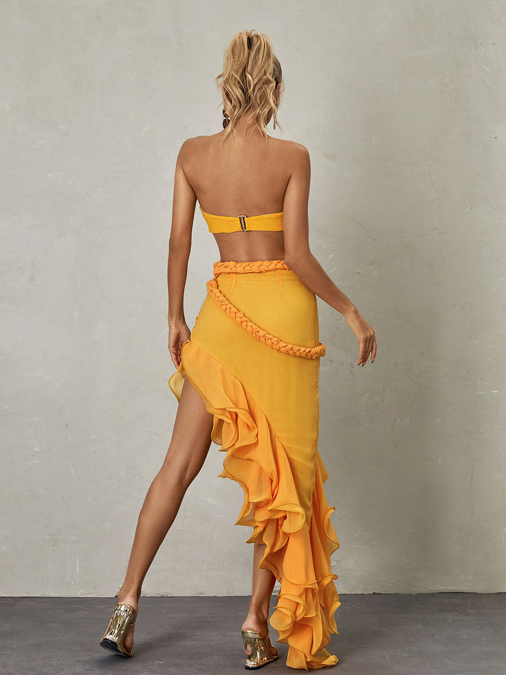 Exude elegance and sophistication in the Daena Strapless Cutout Maxi Dress. This stunning dress features a flattering strapless neckline and a captivating cutout design that adds an alluring touch. With its asymmetric hemline. this dress exudes modern style and ensures you make a memorable entrance at any special occasion.