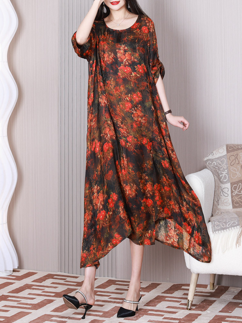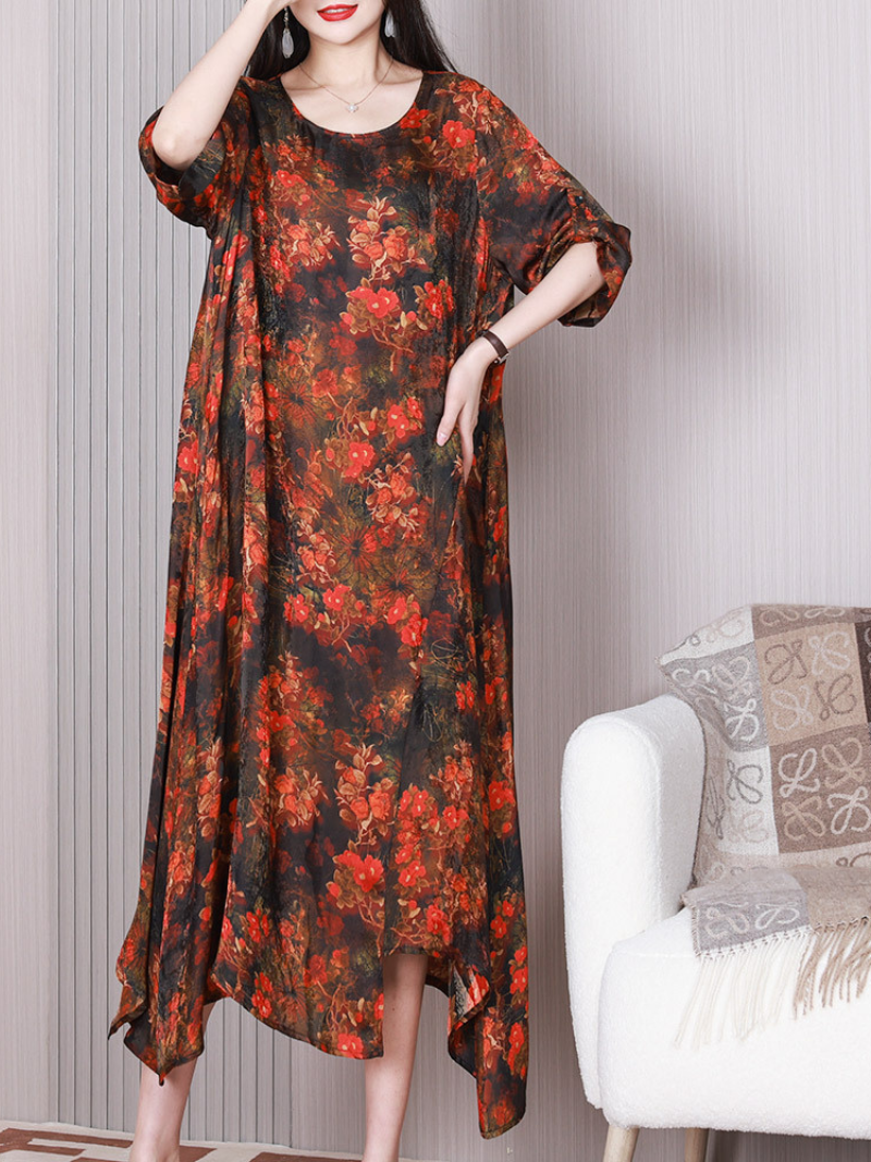This stunning a-line dress is made from high-quality silk. providing both comfort and luxury. The dress comes in a vibrant red color. making it perfect for any occasion where you want to make a statement. It features a classic round neck and a middle waist. creating a flattering and feminine silhouette. The dress is adorned with a beautiful floral pattern. adding a touch of nature to the overall look. The combination of the bold red color and the delicate floral pattern makes the dress perfect for a variety of events. from a summer wedding to a fancy dinner party. The silk material provides a soft and comfortable feel. making it perfect for warmer weather. This dress can be dressed up with heels and accessories or dressed down with sandals and a denim jacket. Its stunning color. floral pattern. and comfortable fit make it a versatile and timeless addition to any wardrobe.