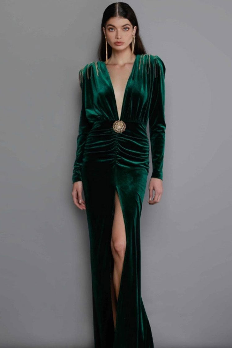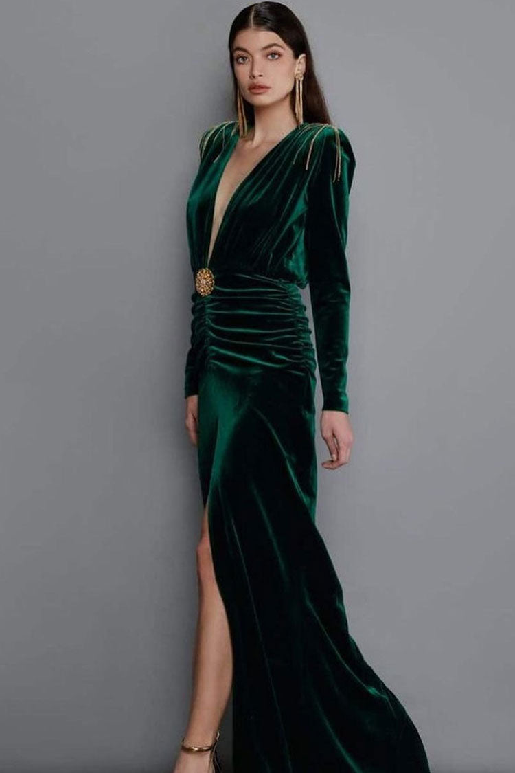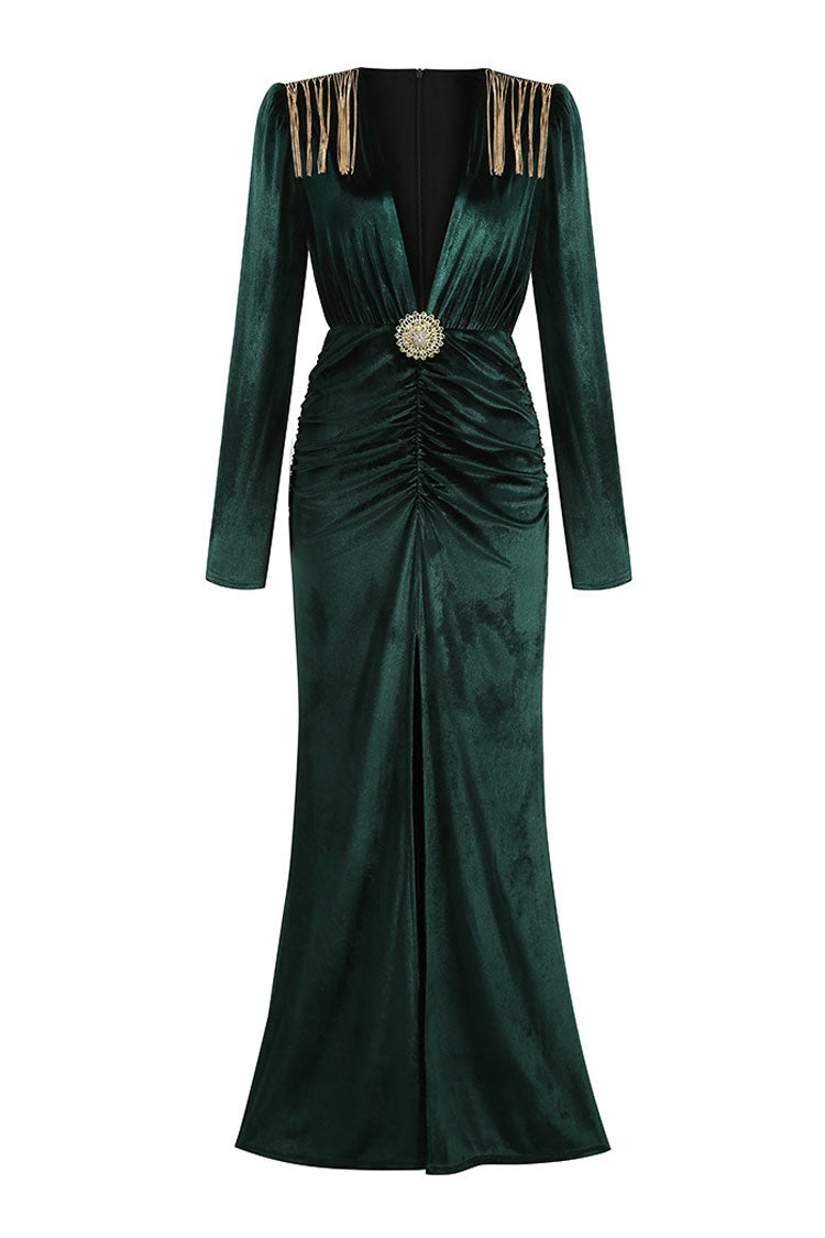 Emerald green velvet dresses for the party season. This deep V long sleeve fringe evening maxi dress in our boutique is the perfect special event outfit for women who are looking glamorous. Completed with a plunging V neckline with a sparkly rhinestone-adorned decoration at the waist. padded strong shoulders with tassel trim. long sleeves. a figure hugging silhouette with ruching detailing and a hidden zip closure at back. a full-length dress cut with a dramatic front slit. this enchanting formal maxi gown looks fantastic for your next evening event beyond in fall and winter. and moreover. it will always be flattering and elongating. Kick it up a notch with a red lip. fringe earrings and an evening-ready pair of stilettos.