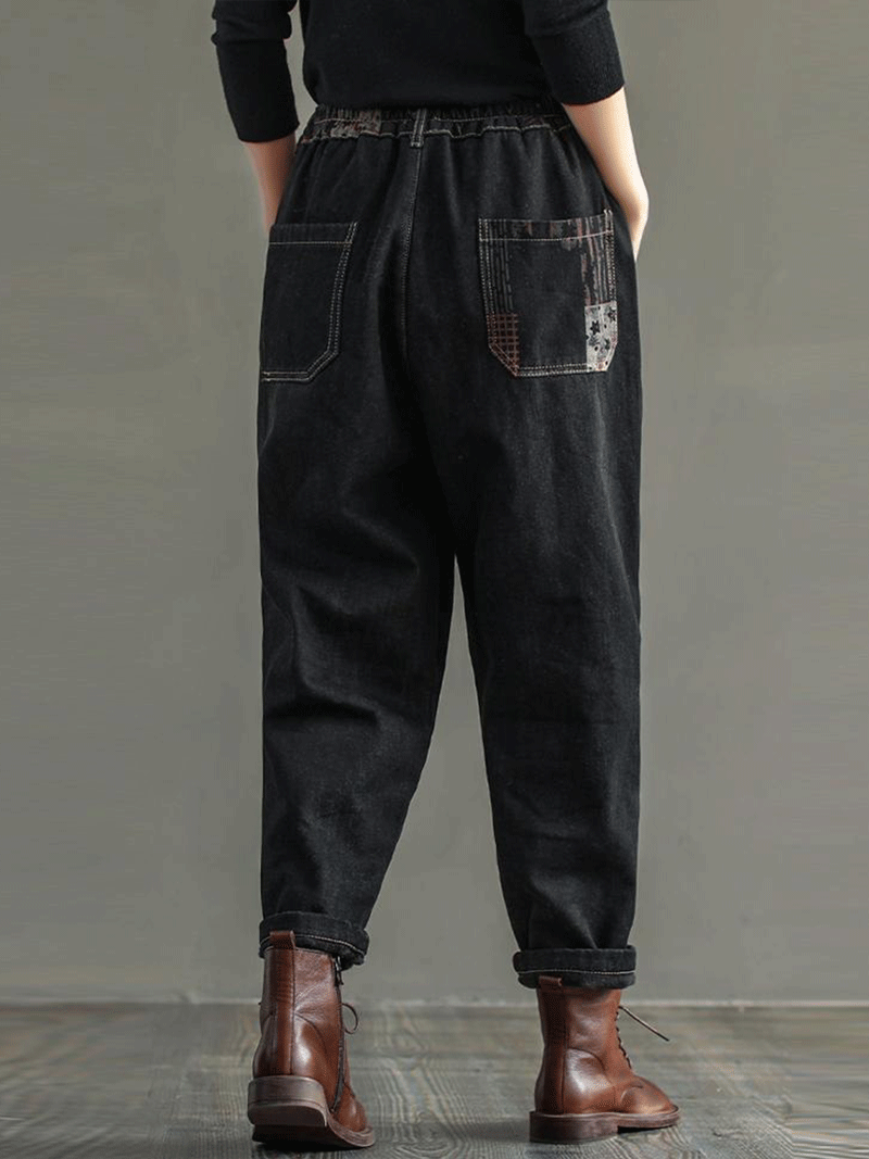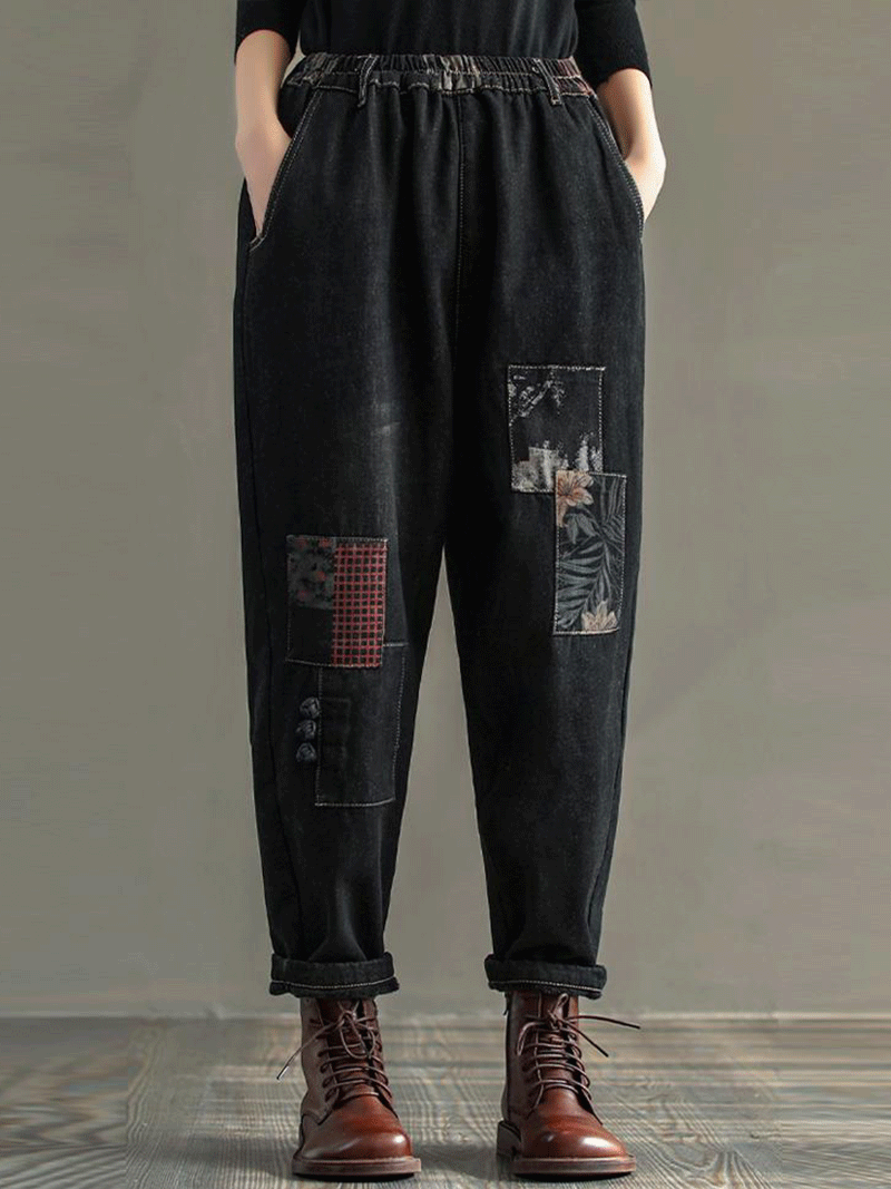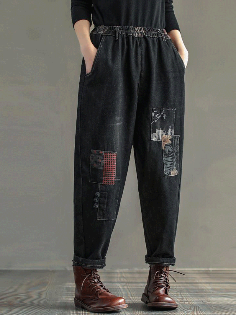 These jogger pants are made of high-quality denim cotton and can be worn all year round. They feature two side pockets and a comfortable elastic waistband. The patchwork detailing on these pants makes them unique and stylish.
