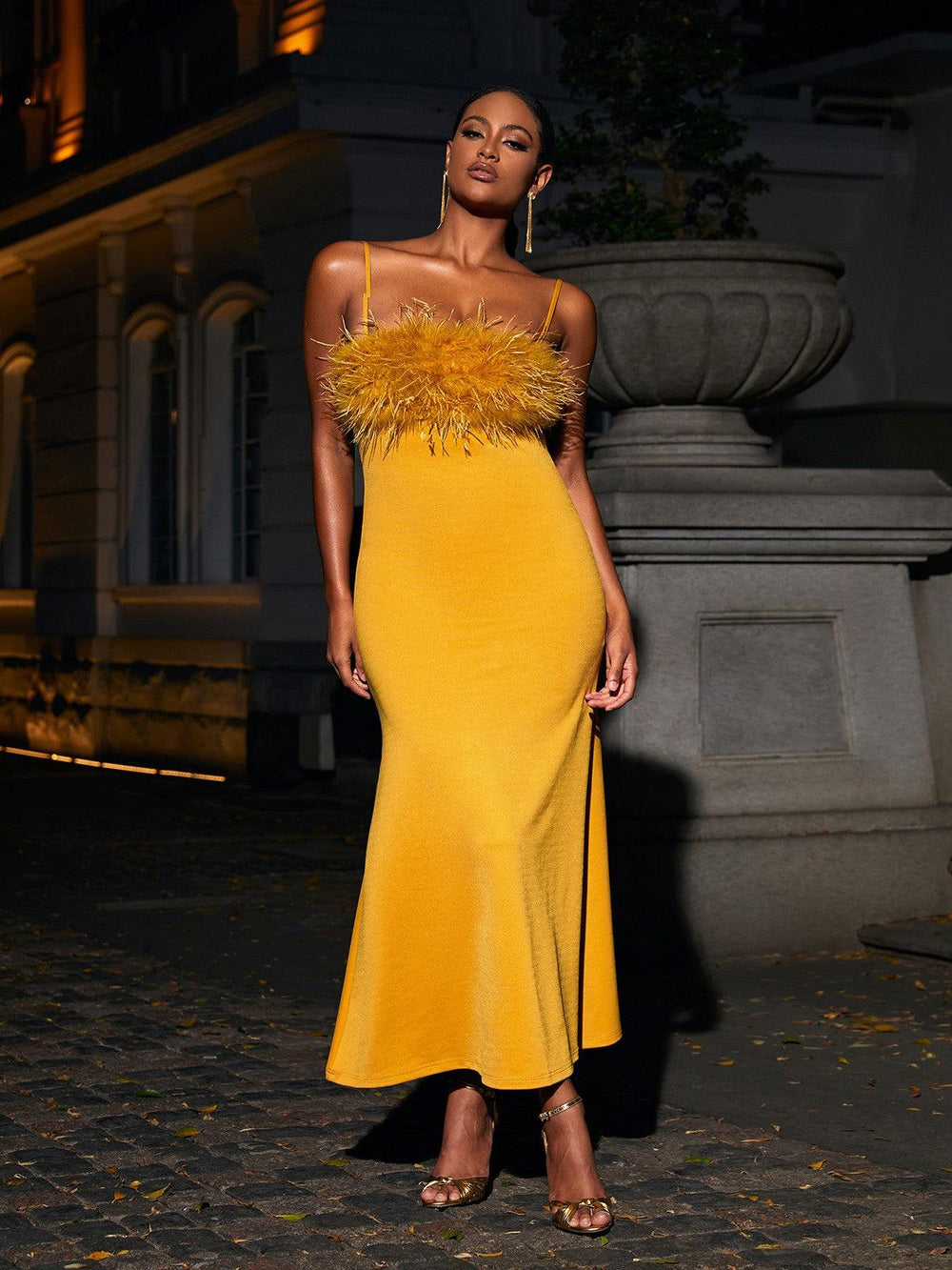 Introducing the Effy Spaghetti Feather Maxi Dress in Yellow. the perfect choice for any fashionista looking to make a statement. The spaghetti strap design showcases a delicate and feminine neckline. while the flowing. maxi-length skirt adds a touch of elegance and sophistication. The soft. feathery detailing along the hemline adds a playful and whimsical touch. making this dress the perfect choice for any formal occasion.