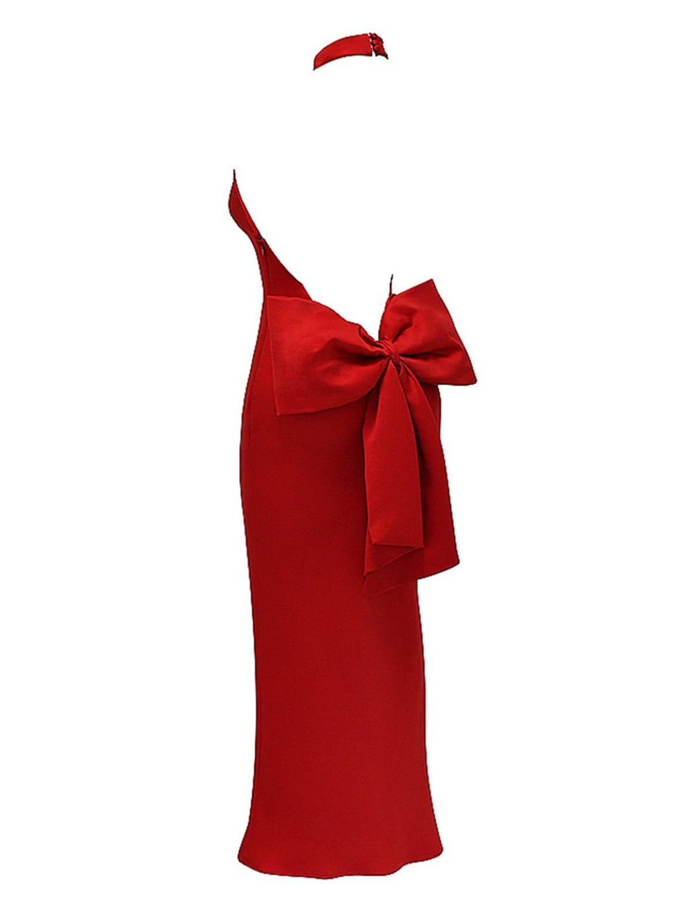 The Eirian Halterneck Bow Backless Maxi Dress is just perfect for all your special events. Cut from our lustrous red satin. the dress keeps it simple yet sexy with a side splicing halter top that reveals just a hint of side boob. All the drama is in the back with an ultra low back and oversized bow.
