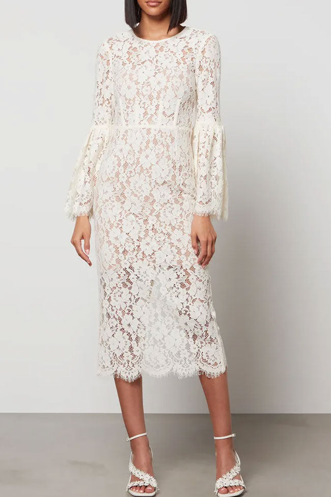 Elegant lace dresses never go out of style and this delicate lace midi dress in our boutique will amplify timeless elegance and femininity for women. Designed with a classic round neckline. a hidden zip closure and a hoop button at back creating a subtly keyhole cutout. 3/4 sleeves with eyelash-trim flared cuffs. and the sheath silhouette with lining inside. and an eyelash-detail scalloped mid-length dress cut. this graceful little white dress gives us a luxury vibe with depth and texture. Make an impression at your next special occasion with this effortless chic outfit and dainty white heels.