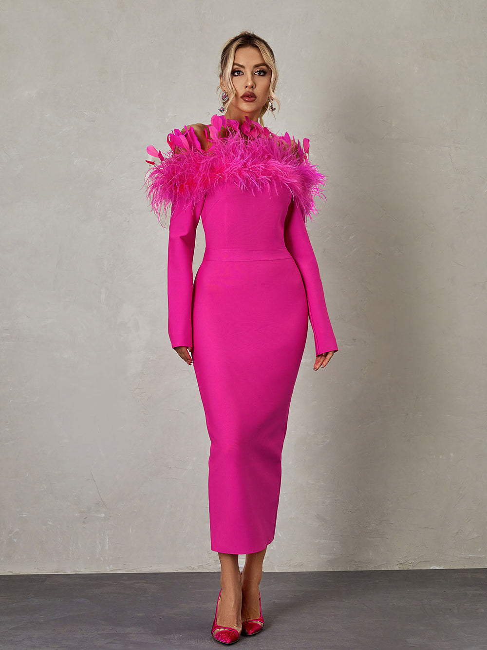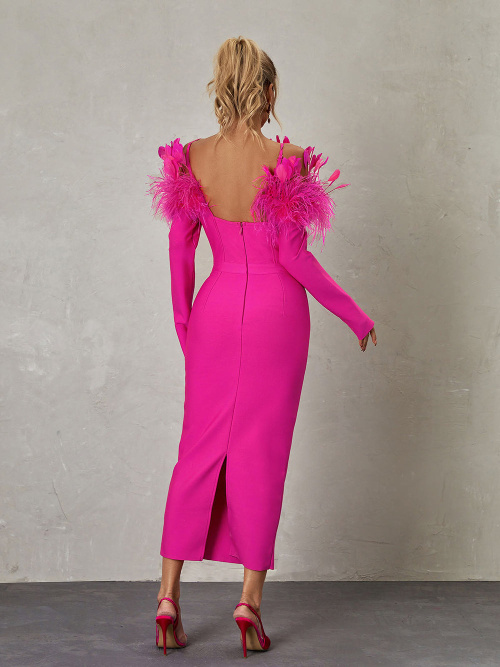 Look unforgettable in this stunning Ember Off Shoulder Feather FielShop Dress. This hot pink midi dress has an off shoulder. spaghetti straps. and an eye-catching feather FielShop detail on the chest for added texture. The back features a slit for a touch of elegance.