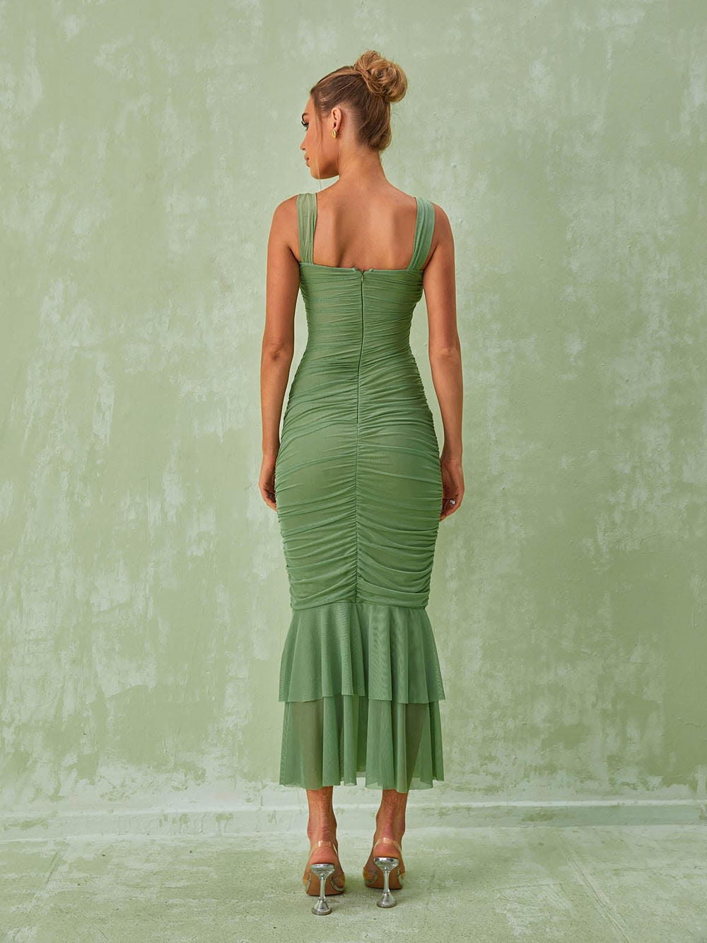 This Eri Ruched Mesh Maxi Dress In Green is the perfect combination of style and comfort. Its maxi length and subtle ruching create an elegant silhouette that is further enhanced by the delicate mesh detailing. This dress is perfect for any special occasion. guaranteeing you look and feel your best.