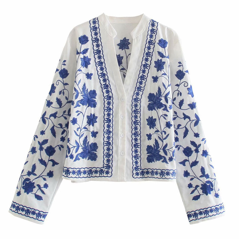 Floral blouses are having a major moment right now. and with this top. so pretty! Crafted with blend cotton and polyester. embellished with contrasting flower embroidery throughout. featuring a straight fit structured with long sleeve styling. a split-V neckline along with a button placket to the front and a straight hem. Find more unique women's blouses or trendy clothing in our boutique. and wear it with vintage denim and simple heels.