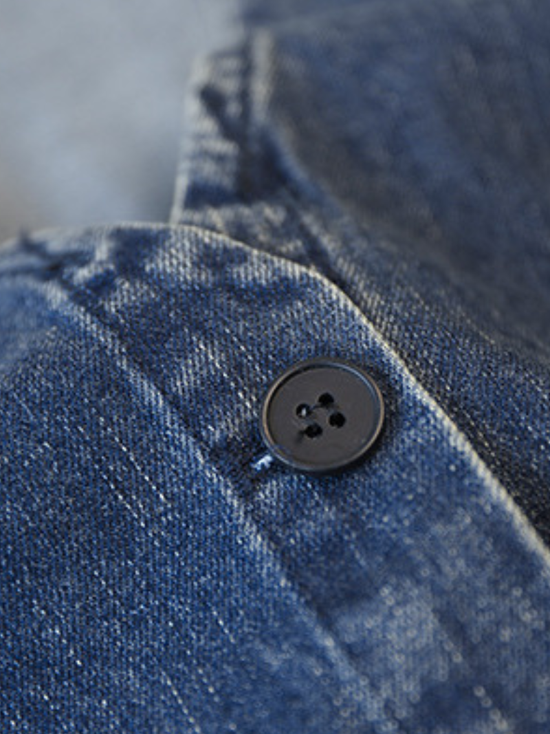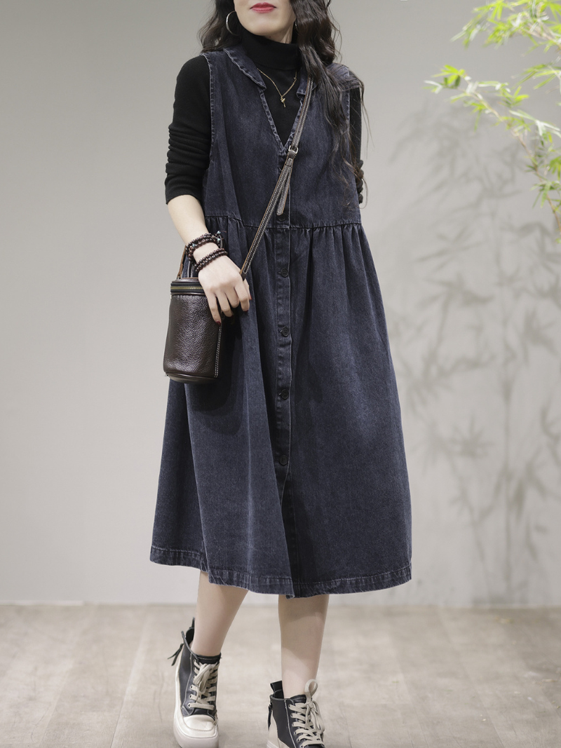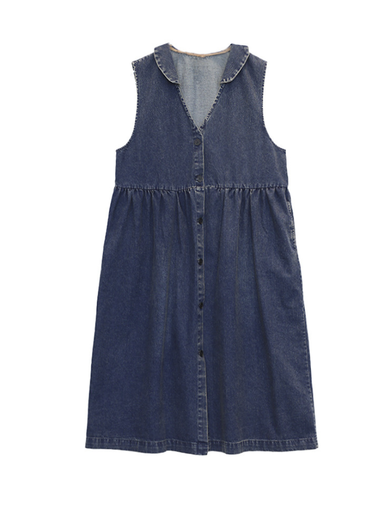Denim cardigan style sleeveless midi dress in light blue / dark blue the denim cardigan style midi dress is made from 100% cotton and comes in two colors: light blue and dark blue. It has an A-line skirt and V-neckline. The length measures 110cm / 43.3 inch for the S size and 112cm / 44.0 inch for the M size. The bust measures 108cm / 42.5 inch for the S size. 112cm/44.0 inch for the M size. The shoulder measures 38cm / 14.9 inch for the S size and 40cm / 15.7 inch for the M size .