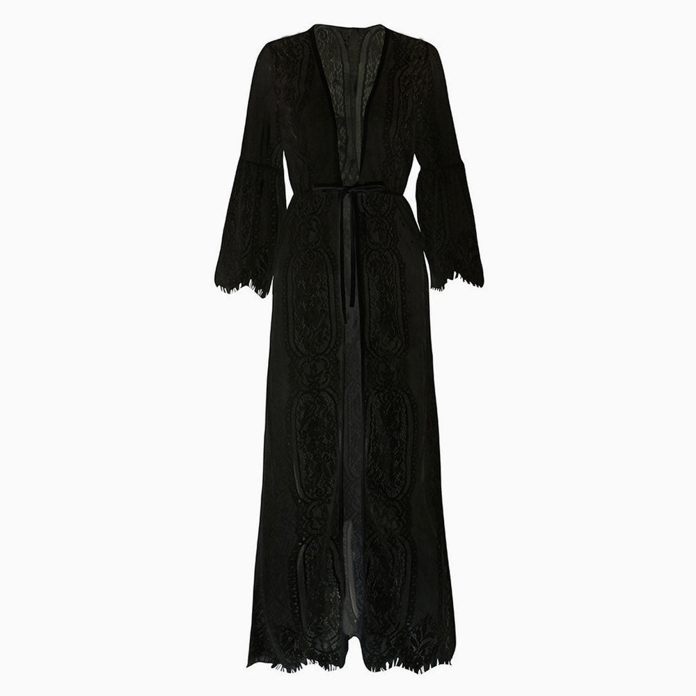 This cover up is a low-key sweet option for your beach sunny days. Made of blend cotton and lace fabric. stand out in delicate floral-lace overlay silhouette trimmed with delicate eyelash lace on cuffs and the hem. featuring an open front accented with a tie. elbow sleeves tailored with split flared cuffs. and a long hem. Find more unique women's cover-ups or delicate clothing in our boutique. and finish a trendy beach-day look with your favorite matching sets.