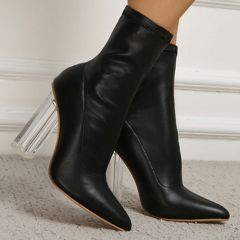 Elevate all your dressy looks this season with the high heel ankle booties. Made of PU leather and rubber. embellished with a transparent block high heel anchored by a opaque rubber heel cap. featuring a closed pointed toe. a slightly padded footbed. a slip-on styling framed by a burnished shaft and tonal seams trimmings. Find more trendy women's pointed-toe boots and unique shoes in our boutique. and wear them with a rib-knit skirt matching set and a shoulder bag - Heel height: 10.5cm.