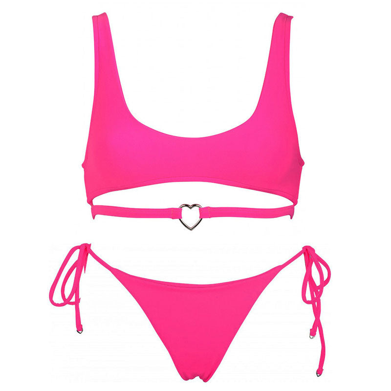 Lounge in your cabana in this darling two piece swimsuit. Made from stretchy nylon and spandex in solid color. embellished with a dramatic cut-out along with a metal heart trim. featuring a scoop neck swim top along with removable pads. elastic suspender shoulder straps and a clasp closure to the rear. complete a trendy beach look with a pair of skimpy back coverage thong bottom distinguished with tied strings each side. Find more women's bikini sets or unique boutique swimwear. and add a floppy hat and kick back and enjoy a day poolside.