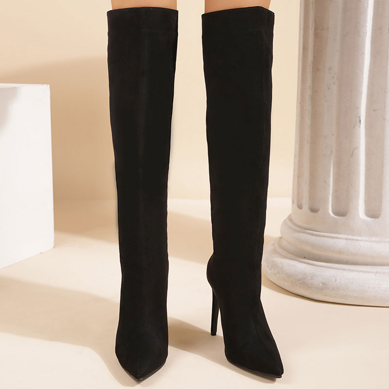 Elevate all your dressy looks this season with the high-heel tall boots. Crafted with faux suede and rubber. stand out in a split design at the opening. featuring a closed pointed toe. a cushioned footbed anchored by a stiletto high heel and a rubber heel cap. a rear zip fastening. Find more trendy women's suede boots and unique shoes in our boutique. and wear them with a velvet mini dress and a shoulder bag for maximum impact - Heel height: 10.5cm.